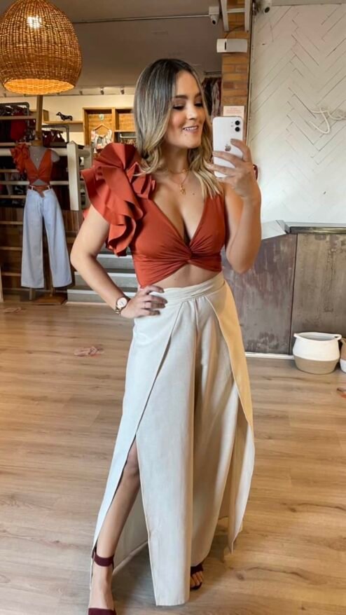 Body cruzado en el pecho con abertura en el abdomen, de manga siza con detalle de golas en un hombro.
