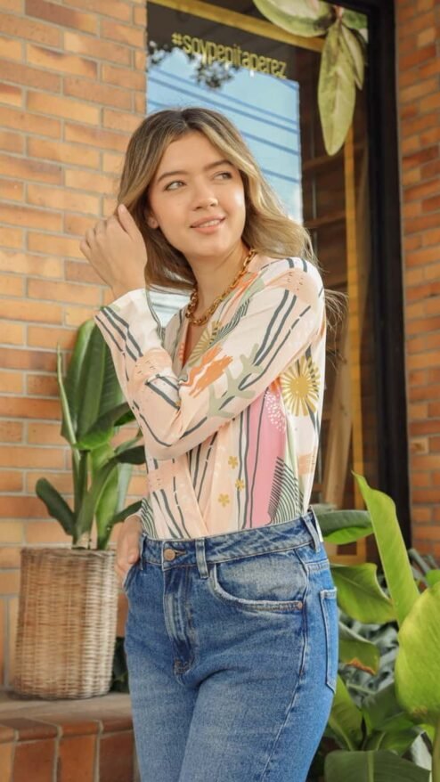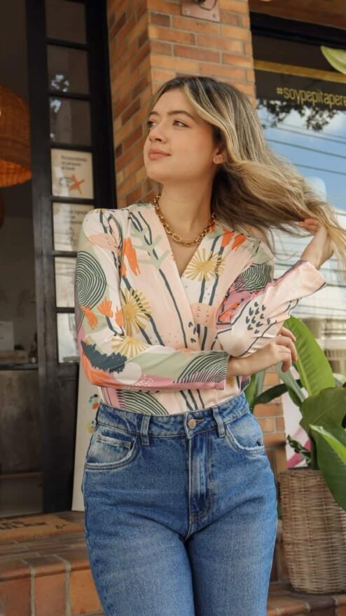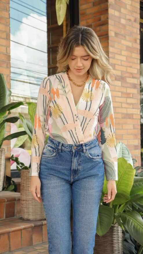 6 valoraciones en Body manga larga con escote en V en estampado abstracto en colores pasteles