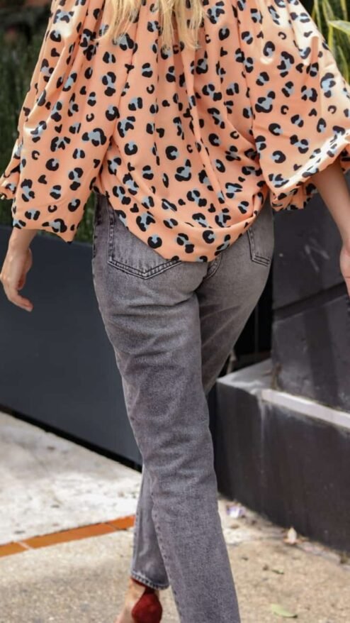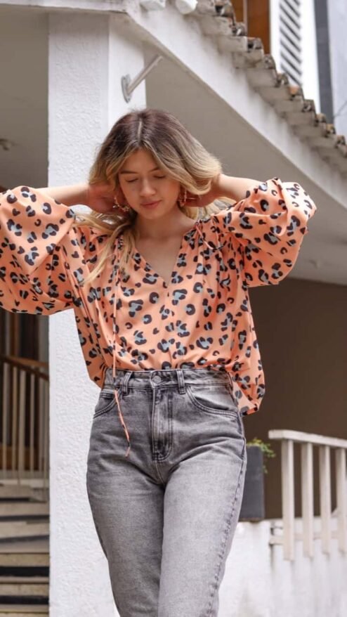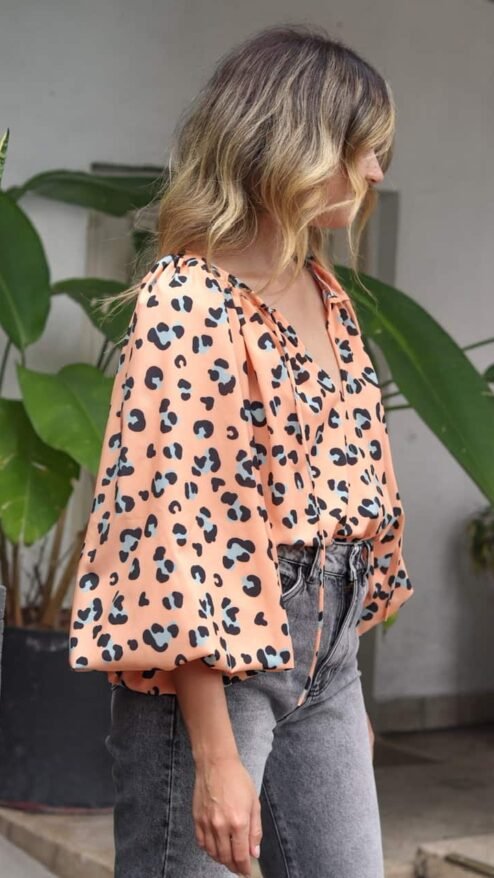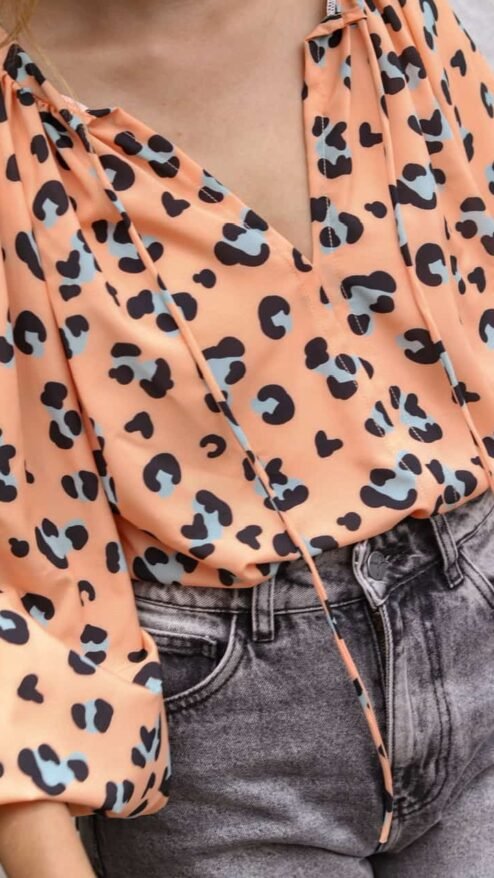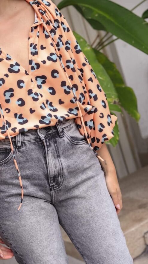 Camisa oversized de silueta muy amplia. Manga bombacha y cordón en el cuello con el que puedes ajustarlo y cerrarlo. Estampado de animal print en color negro y celeste, de fondo durazno.