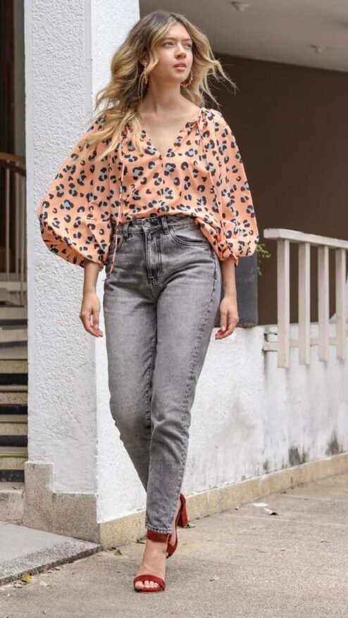Camisa oversized de silueta muy amplia. Manga bombacha y cordón en el cuello con el que puedes ajustarlo y cerrarlo. Estampado de animal print en color negro y celeste, de fondo durazno.