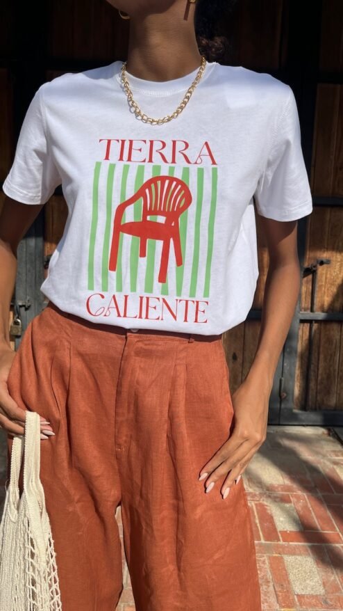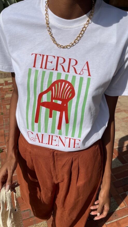 - Diseño: Estampado central de una silla plástica roja, símbolo icónico de las regiones cálidas, sobre un fondo de rayas verdes que añade dinamismo y frescura al diseño. La frase «Tierra Caliente» complementa el gráfico, destacando su inspiración latina.