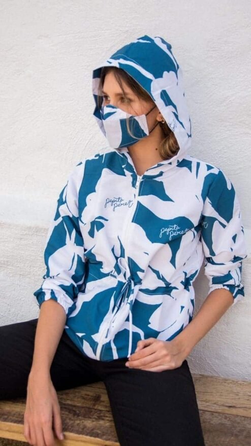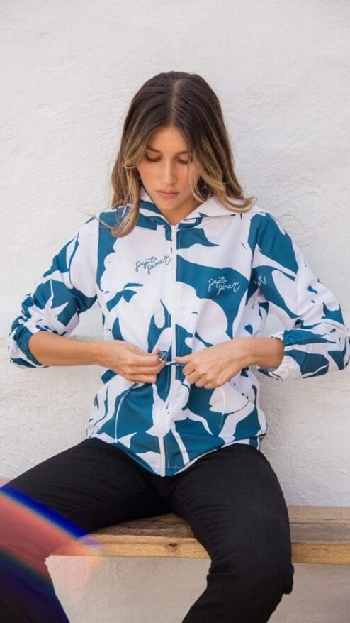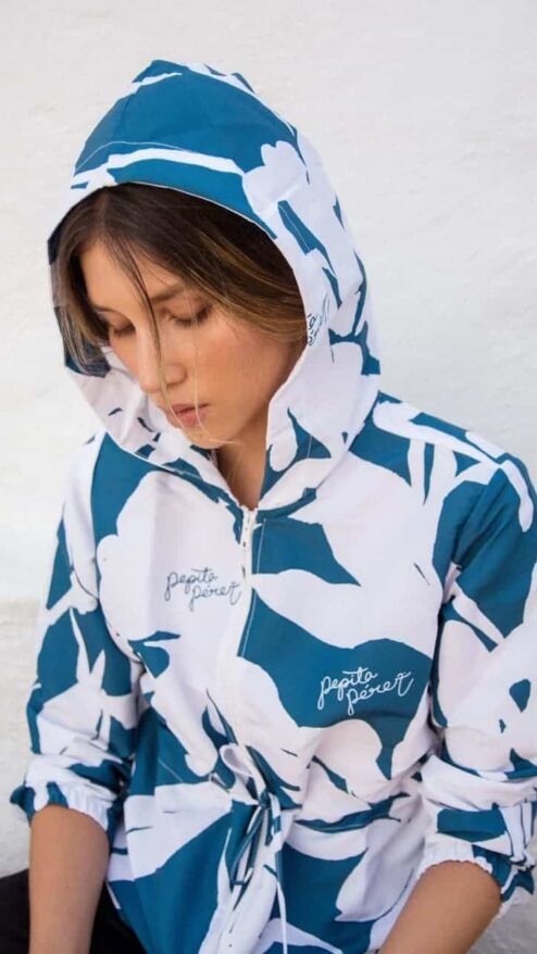 Chaqueta en antifluido en estampado maxi floral en color blanco de fondo azul.