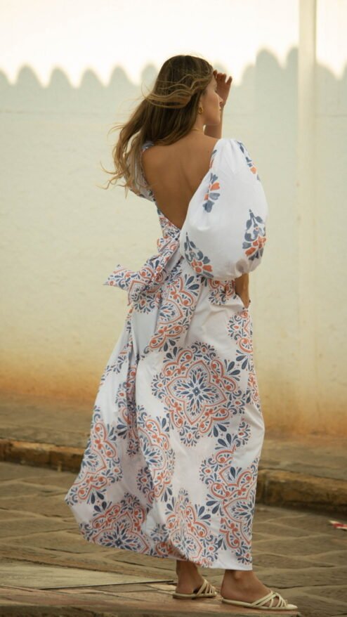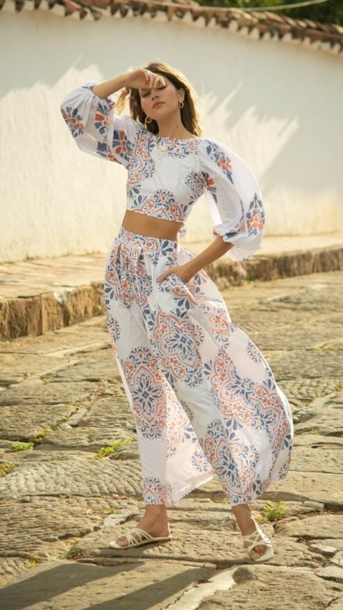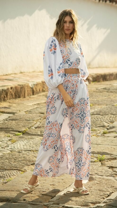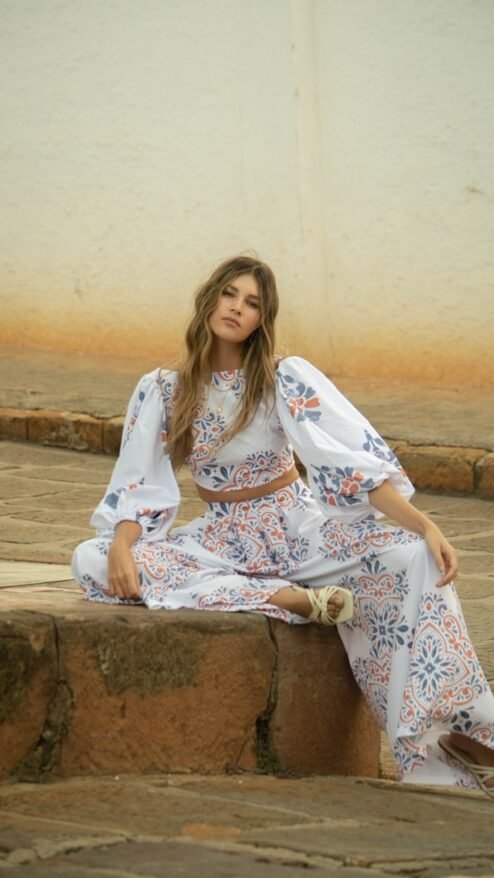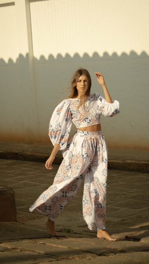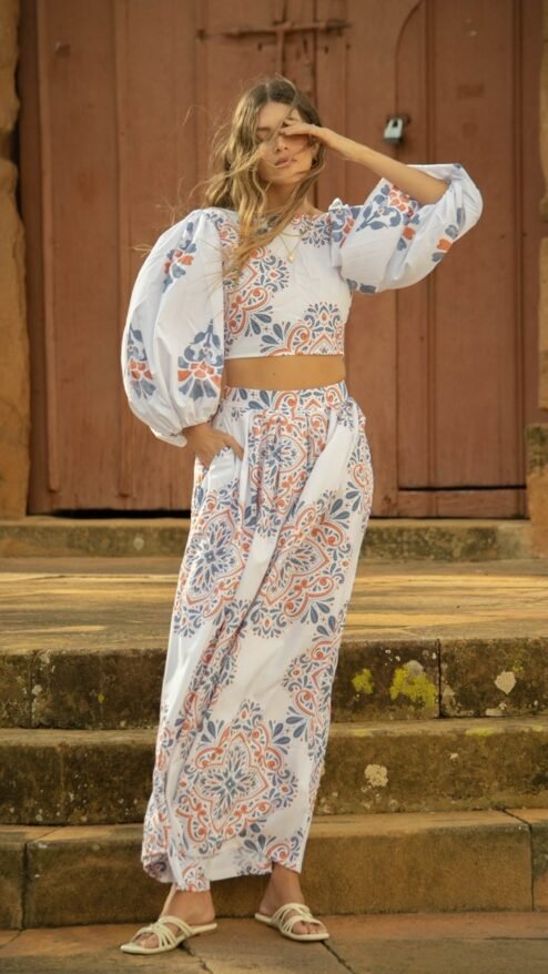 Crop top de manga bombacha con elástico en el puño y escote de amarrar en la espalda, en estampado de mosaicos en tono naranja y azul, de fondo blanco.