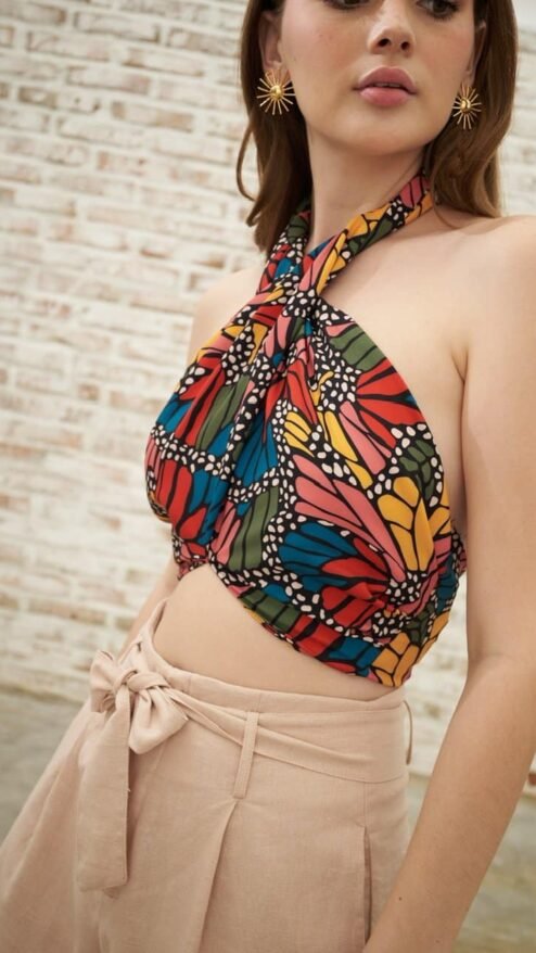 ¡Permite que nuestro Crop top Eliza te lleve de un paseo informal por la playa a una noche de rumba con las chicas! Este lindo croptop tiene una silueta envolvente tipo halter con espalda resortada, tirantes anchos que se atan en el cuello y un estampado colorido increíble. Es una pieza sexy, flirty y versátil que se puede combinar con prendas informales o más formales.