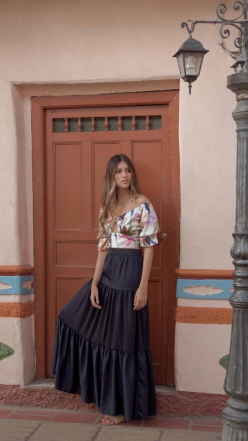 1 valoración en Crop top en seda, cruzado en el pecho con manga bombacha, en estampado floral de fondo blanco