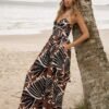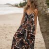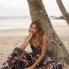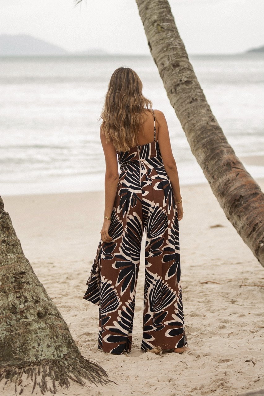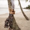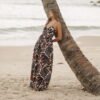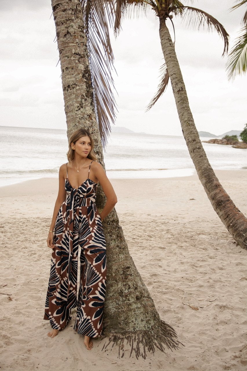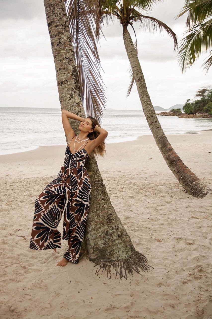 El estampado geométrico en tonos tierra, negro y marfil evoca hojas tropicales y sombras danzando al atardecer. Confeccionado en una tela suave, fresca y de caída liviana, es una prenda que se mueve contigo y se adapta a cualquier escenario con elegancia natural.