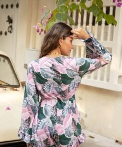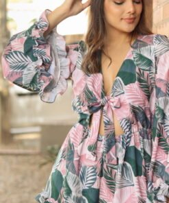 Enterizo corto de manga larga acampanada, de amarrar en el pecho, en estampado de hojas en colores verde y rosado.