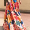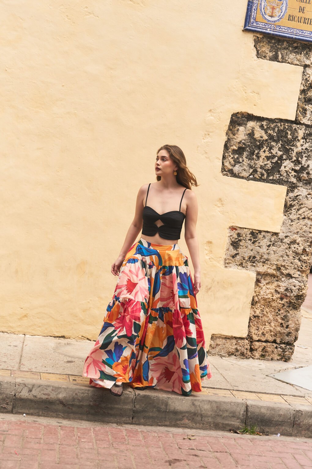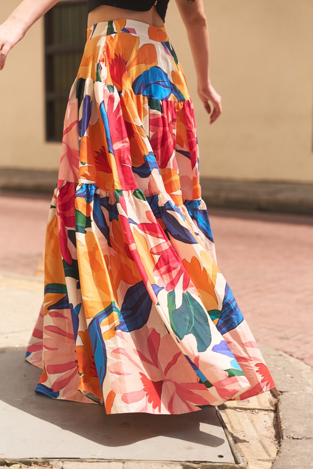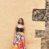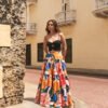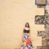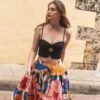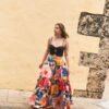 El estampado, inspirado en flores latinas y frutas tropicales, celebra la exuberancia y espontaneidad de nuestra región. Con cintura alta y cortes en bloques de color, su caída crea un efecto de vuelo muy amplio que acompaña cada paso.