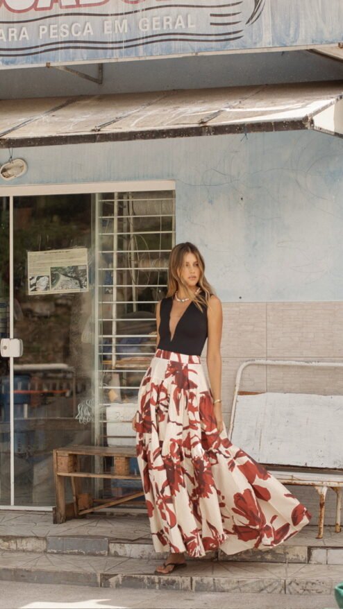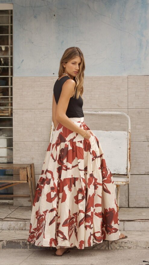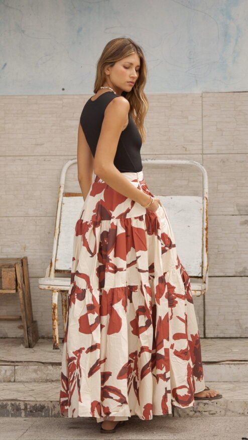 La Falda Garza combina estructura y fluidez en perfecta armonía. Su silueta larga y amplia cae con elegancia, creando un efecto etéreo al andar. El estampado floral en tonos vinos sobre fondo marfil recuerda los colores del litoral y la textura de la arena bajo el sol. Confeccionada en algodón prémium con una textura ligeramente estructurada y aireada, brinda frescura y comodidad durante todo el día. La pretina alta define la cintura, mientras que los niveles sutiles y el vuelo generoso aportan movimiento natural.