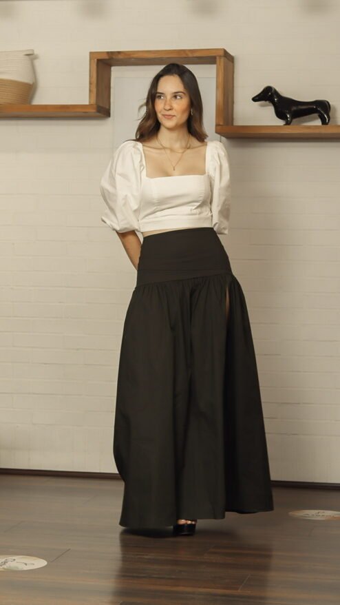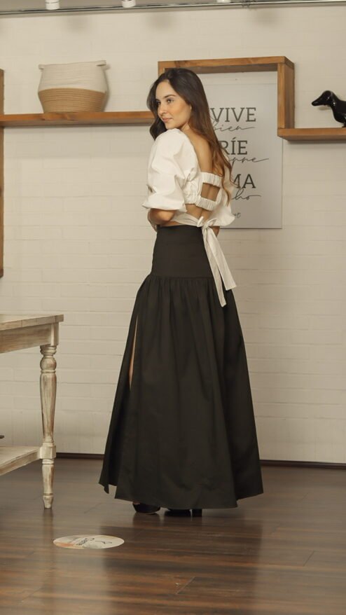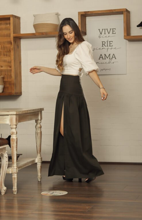Falda larga a la cintura, ajustada en la cadera, con abertura alta, en color verde oscuro.