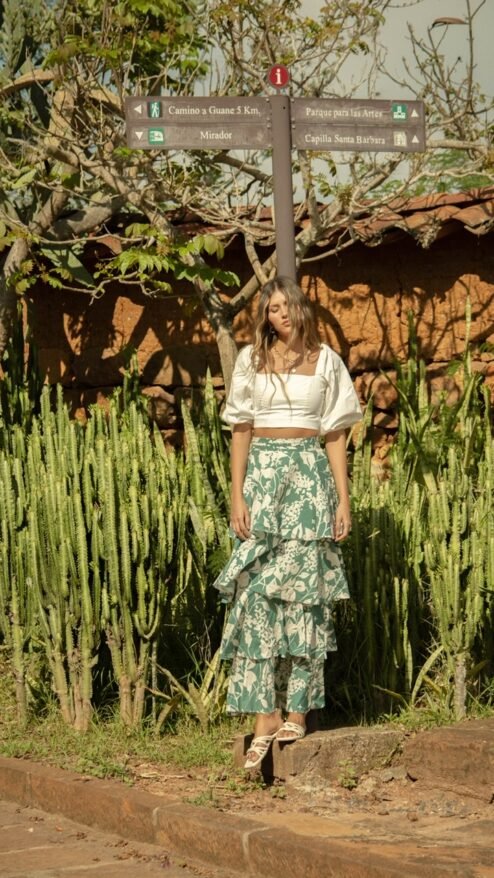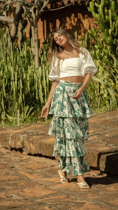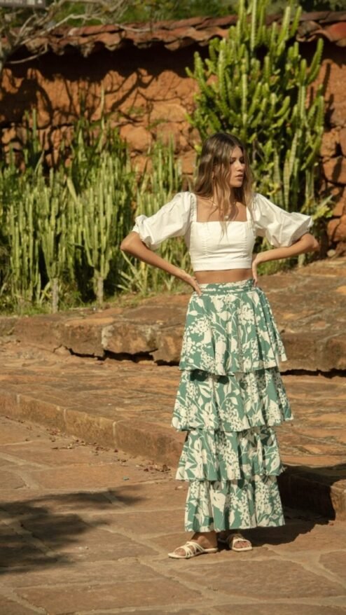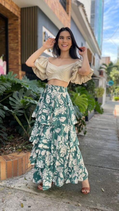 Falda larga de tres capas en tela fresca y fluida en estampado bicolor de siluetas florales y hojas, de fondo verde. Pretina con pliegues.