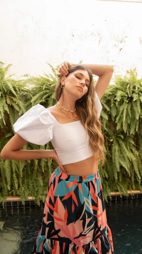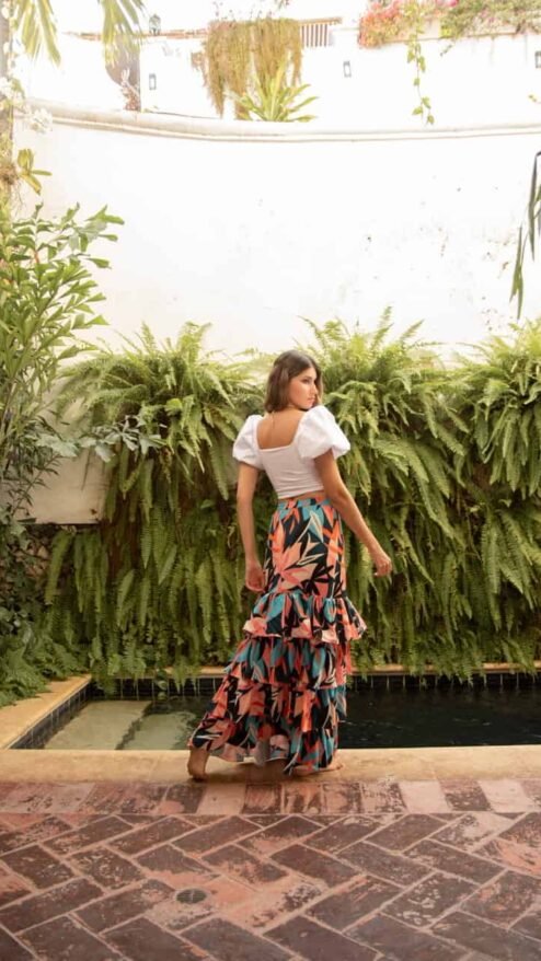 Falda larga, con golas en la parte inferior. En estampado de hojas multicolor en tonos vivos. La cintura o pretina es elástica, no tiene cierre.