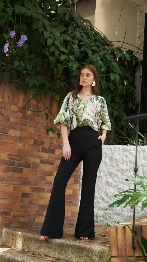 Pantalón de talle alto y bota acampanada, cierre lateral, bolsillos laterales.
