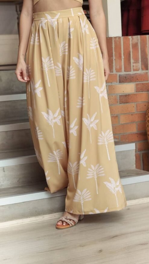 Pantalón muy amplio en estampado de siluetas florales de fondo amarillo pastel