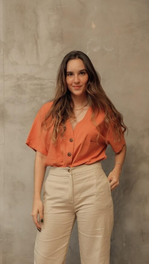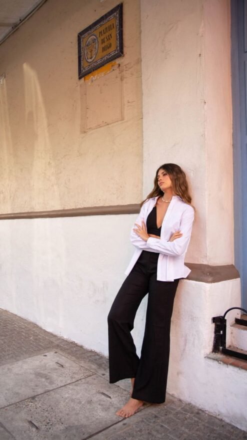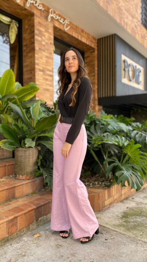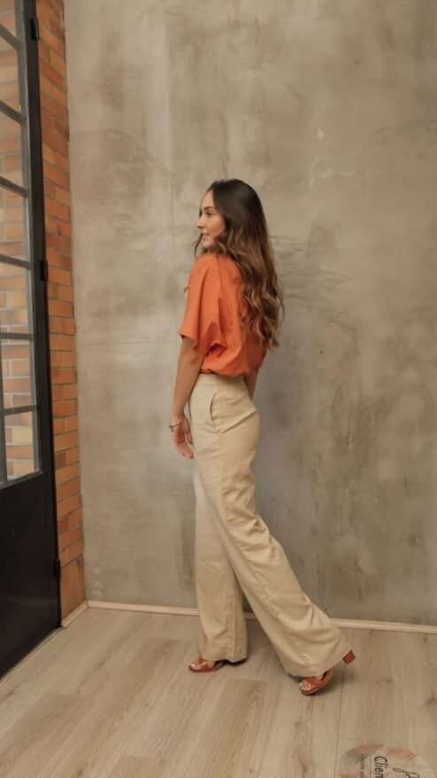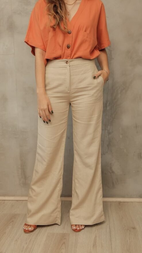 Pantalón de silueta amplia y talle alto en lino de color negro y beige natural. Cierre frontal con cremallera y botón. Bolsillos delanteros.