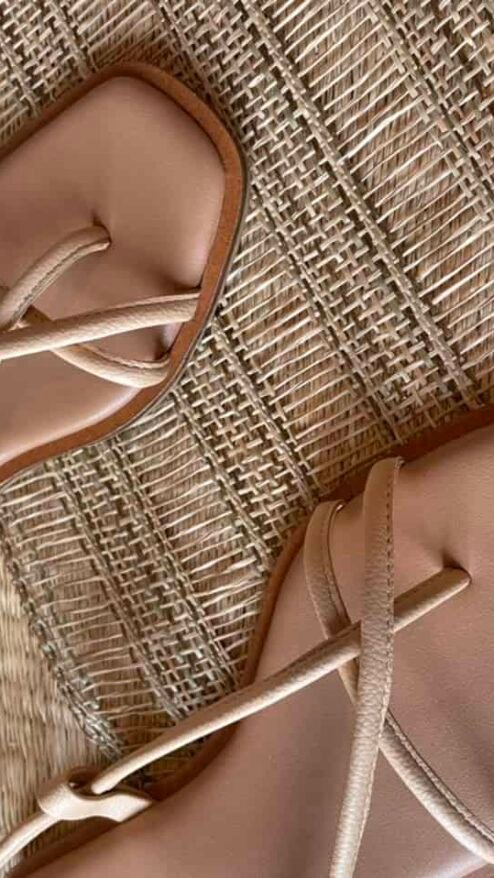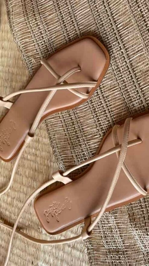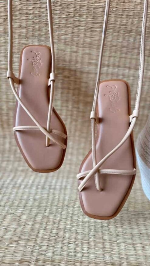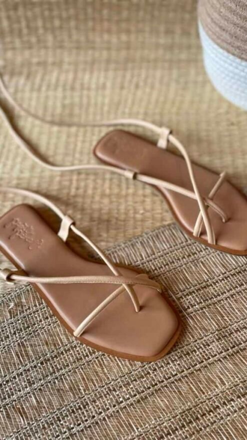 Sandalia plana con tiras largas cruzadas en el pie, que se ajustan al tobillo. Plantilla en color miel, con cerco. Material suave en color beige o crema que se ajusta al pie y proporciona estabilidad y comodidad.