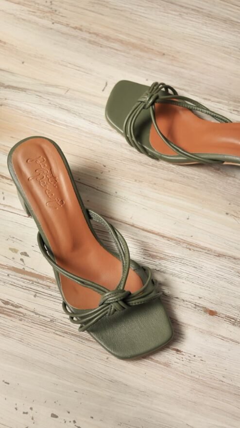 Tacones de altura media en color verde oliva. Tiras delgadas con nudo frontal que proporcionan estabilidad y comodidad pues mantienen el pie en su lugar.