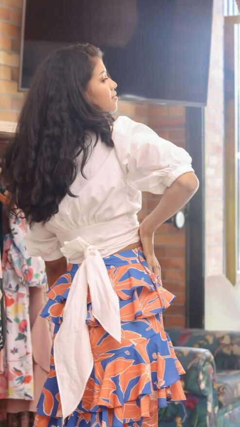 Crop top de amarrar en color blanco, con manga tres cuartos bombacha y tiras largas para amarrarlo, que pueden ser usadas de varias formas.