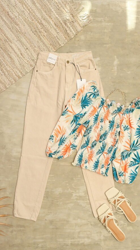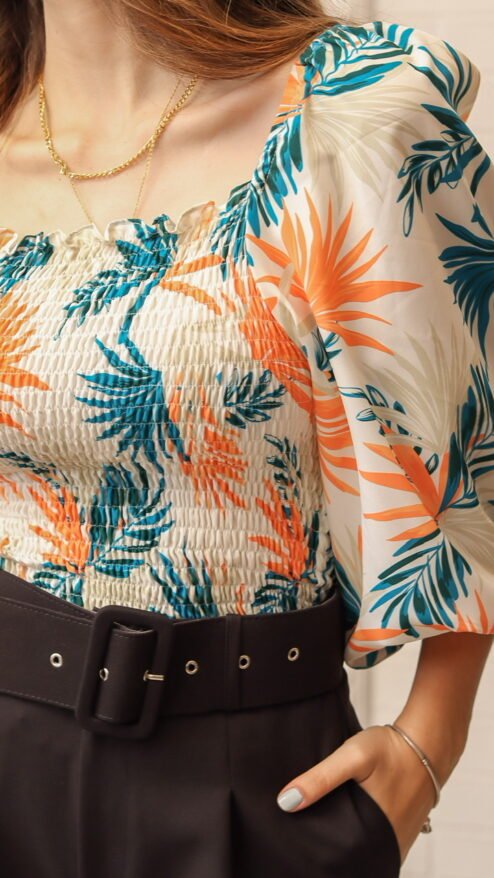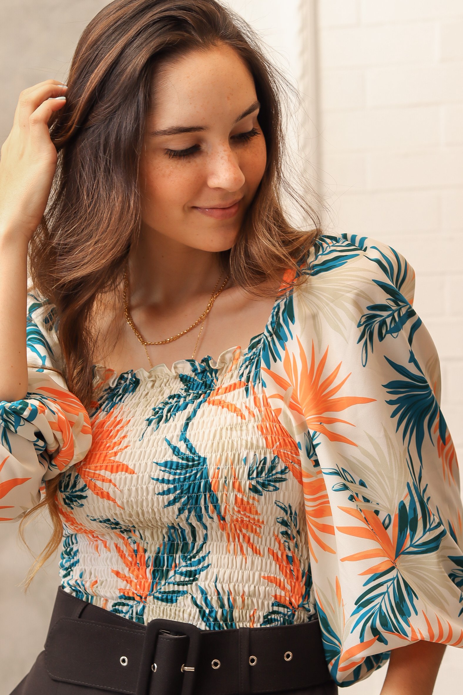 Top largo de cuerpo resortado y manga bombacha, con puño elástico. Estampado de hojas en color turquesa y naranja, de fondo beige.