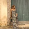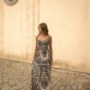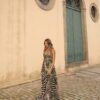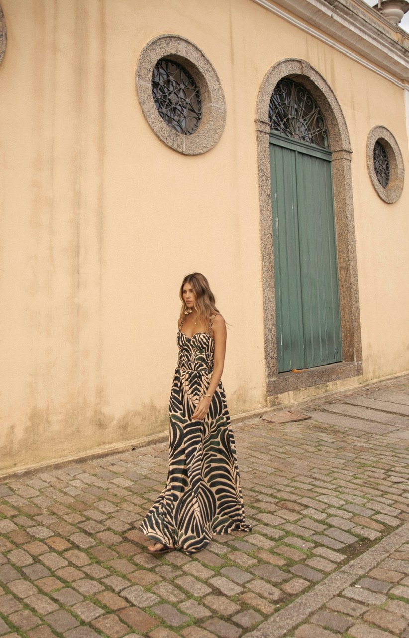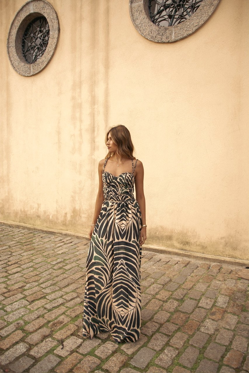El estampado tropical en tonos arena, verde profundo y negro evoca la armonía de la naturaleza: hojas que danzan con el viento y reflejan la calidez del sol. Confeccionado en un textil suave, fresco y con cuerpo, es perfecto para días soleados o tardes que invitan a pasear sin prisa.