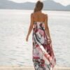 El estampado, un juego de pinceladas amplias en tonos vino, rosados y neutros, tiene un efecto artístico y envolvente que hace de cada vestido una pieza única. La ubicación del estampado puede variar.
