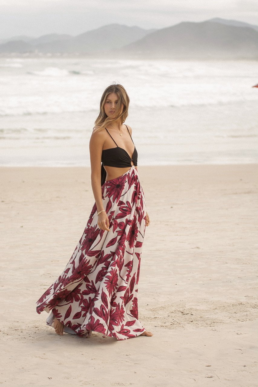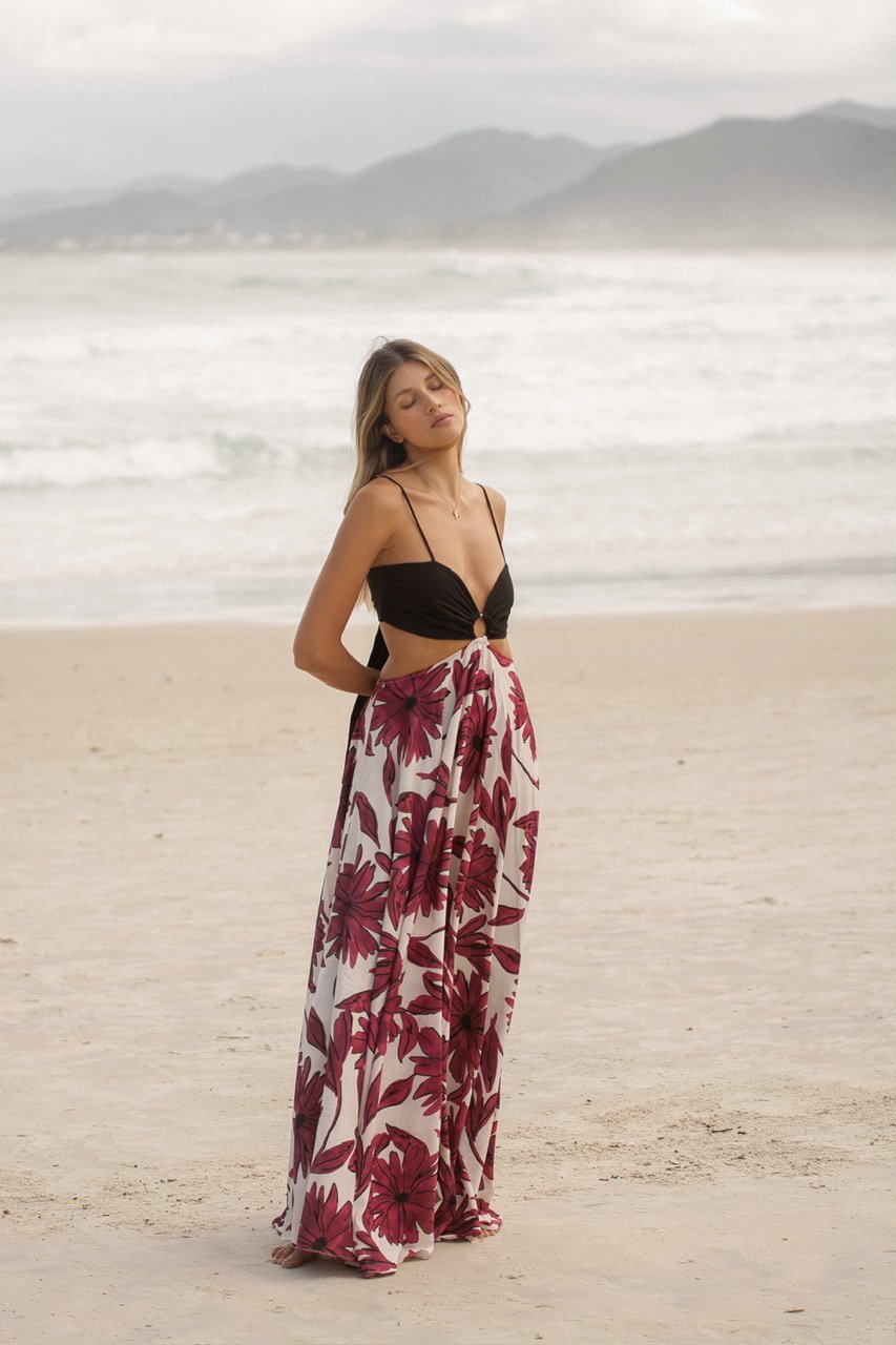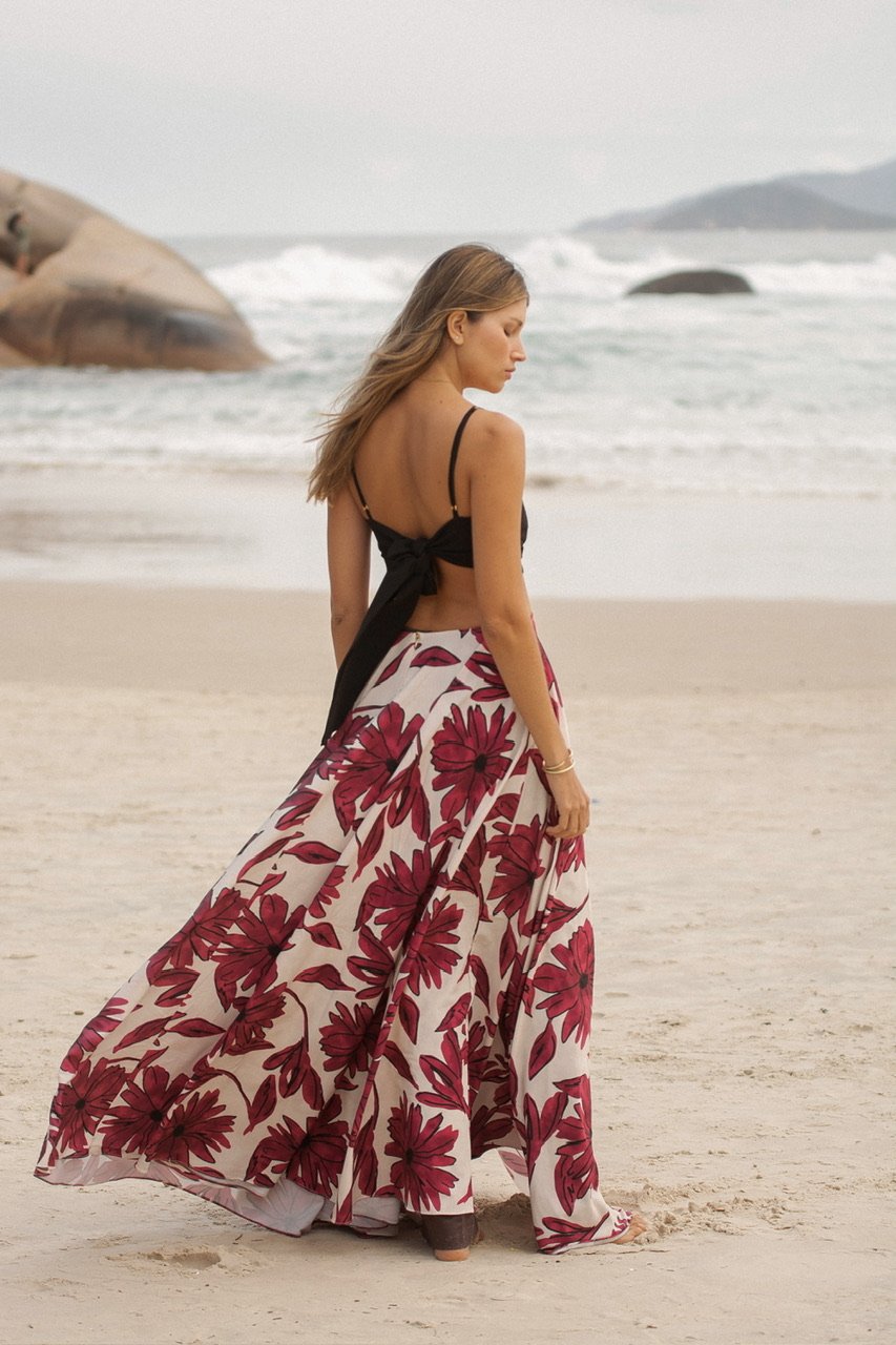 La falda es el verdadero poema visual: un estampado exclusivo de flores púrpura vino sobre fondo claro, con trazos orgánicos que evocan pétalos al sol. Un print vibrante sin ser estridente, diseñado para enmarcar tu silueta con movimiento y frescura.