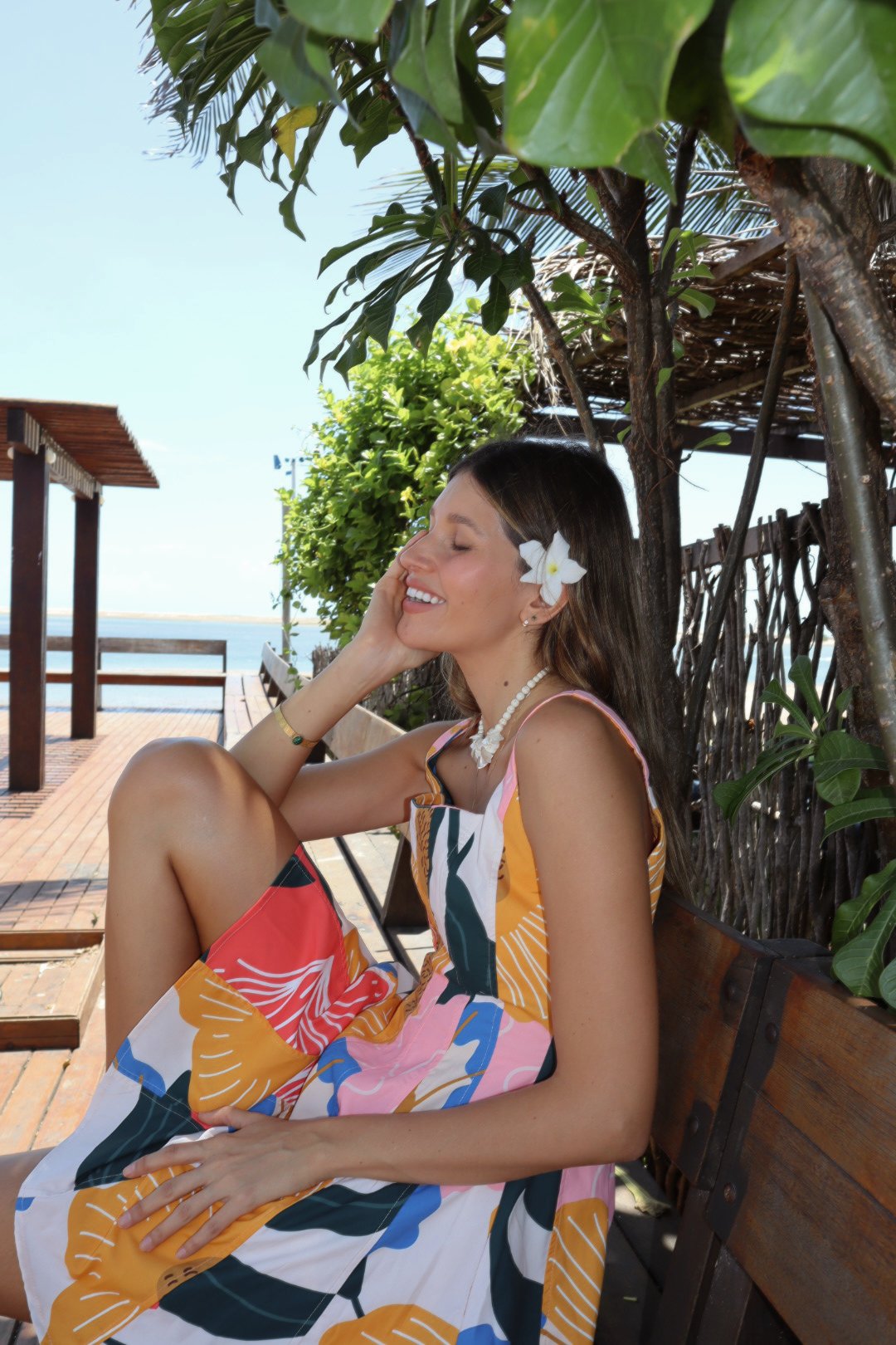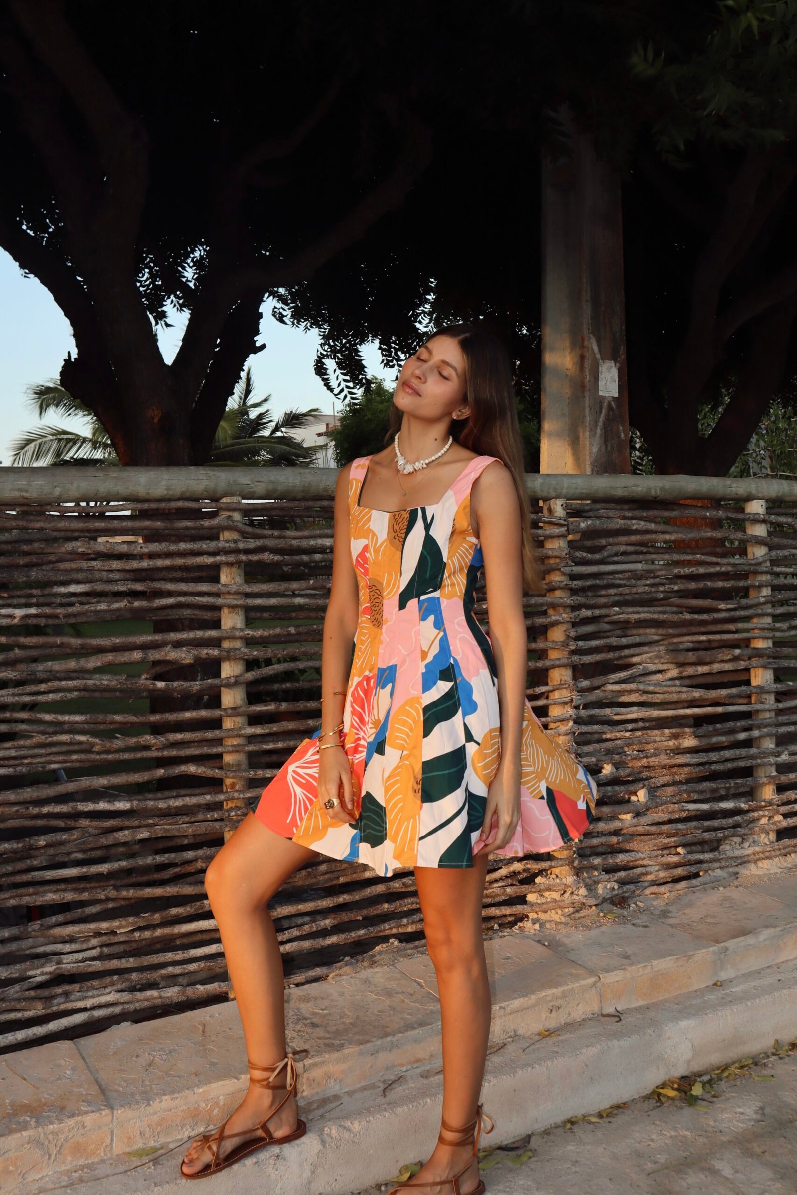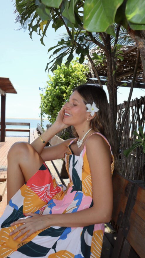 Su silueta ajustada en el torso estiliza delicadamente la figura, mientras la falda fluida y ligera aporta un movimiento encantador con cada paso. El estampado tropical exclusivo, lleno de tonos vibrantes y alegres, hace de este vestido una declaración de estilo imposible de ignorar.