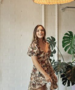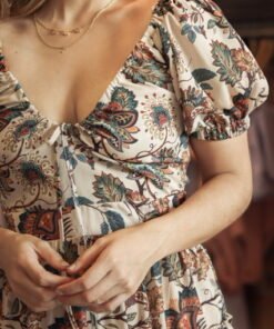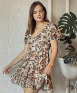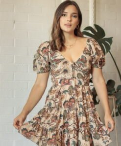 Vestido corto de silueta fit & flare y escote en V, con mangas cortas bombachas y escote cuadrado en la espalda. Cierre en la parte posterior. Estampado floral en colores tierra.