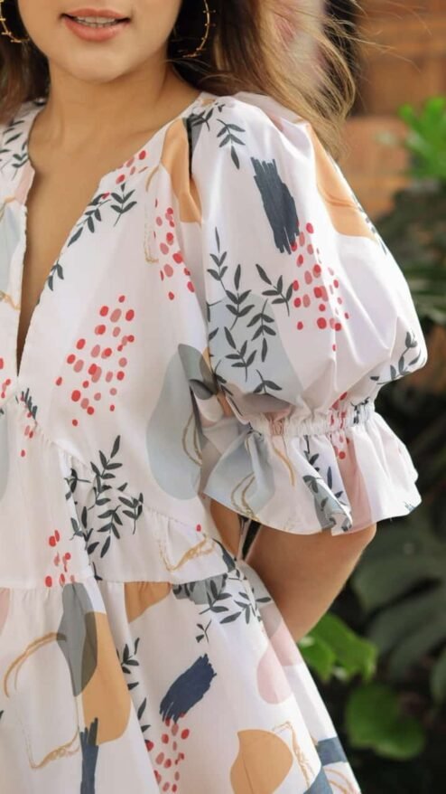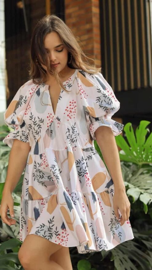 Vestido de silueta muy amplia de longitud mini. Mangas bombachas y cuello en V. Bolsillos laterales. Estampado de hojas y manchas de fondo blanco.