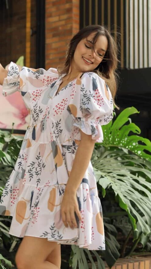 Vestido corto de silueta muy holgada en estampado de hojas y manchas, de fondo blanco