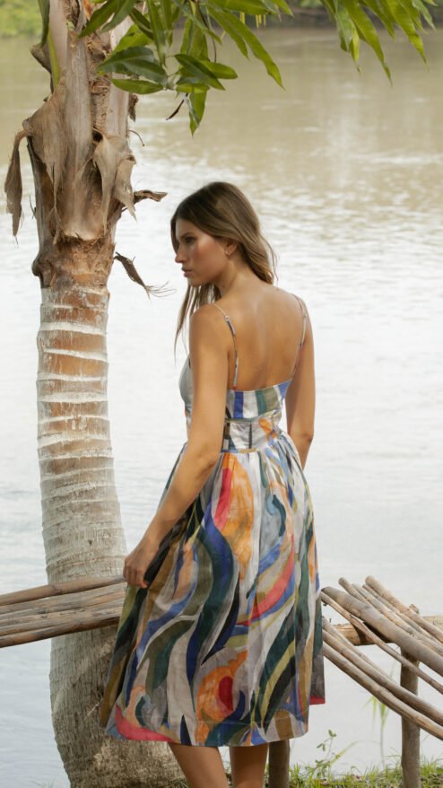 Con una silueta midi de falda amplia que fluye con movimiento, este vestido eleva cualquier momento con su estampado artístico de tonos cálidos, azules, verdes y trazos que parecen salidos de un pincel caribeño. Su escote recto con tiras delgadas y ajustables en la espalda crea una línea femenina y limpia. Su confección en algodón premium 100% brinda mayor estructura y comodidad, y su ajuste en cintura resalta la figura con sutileza.