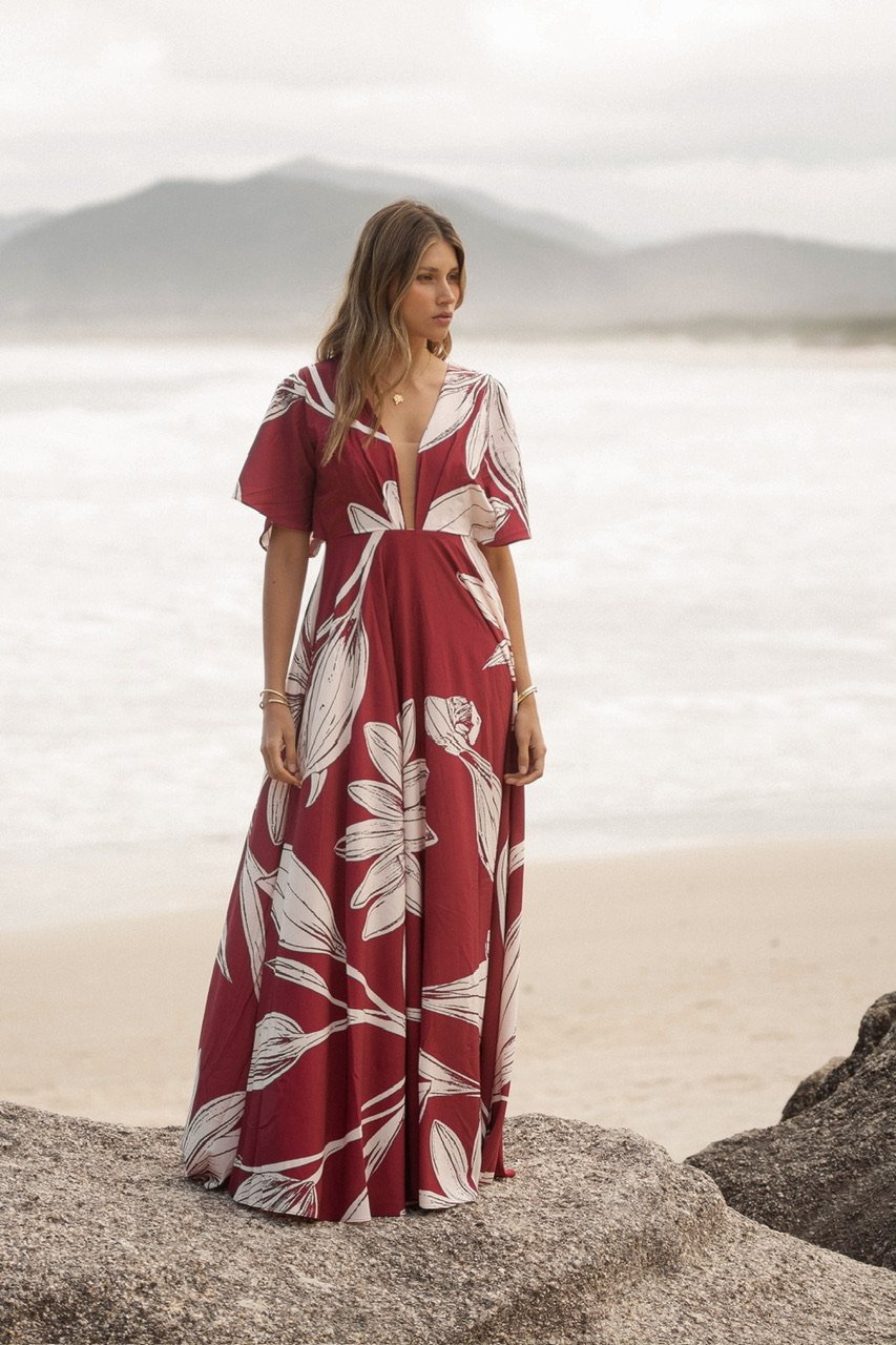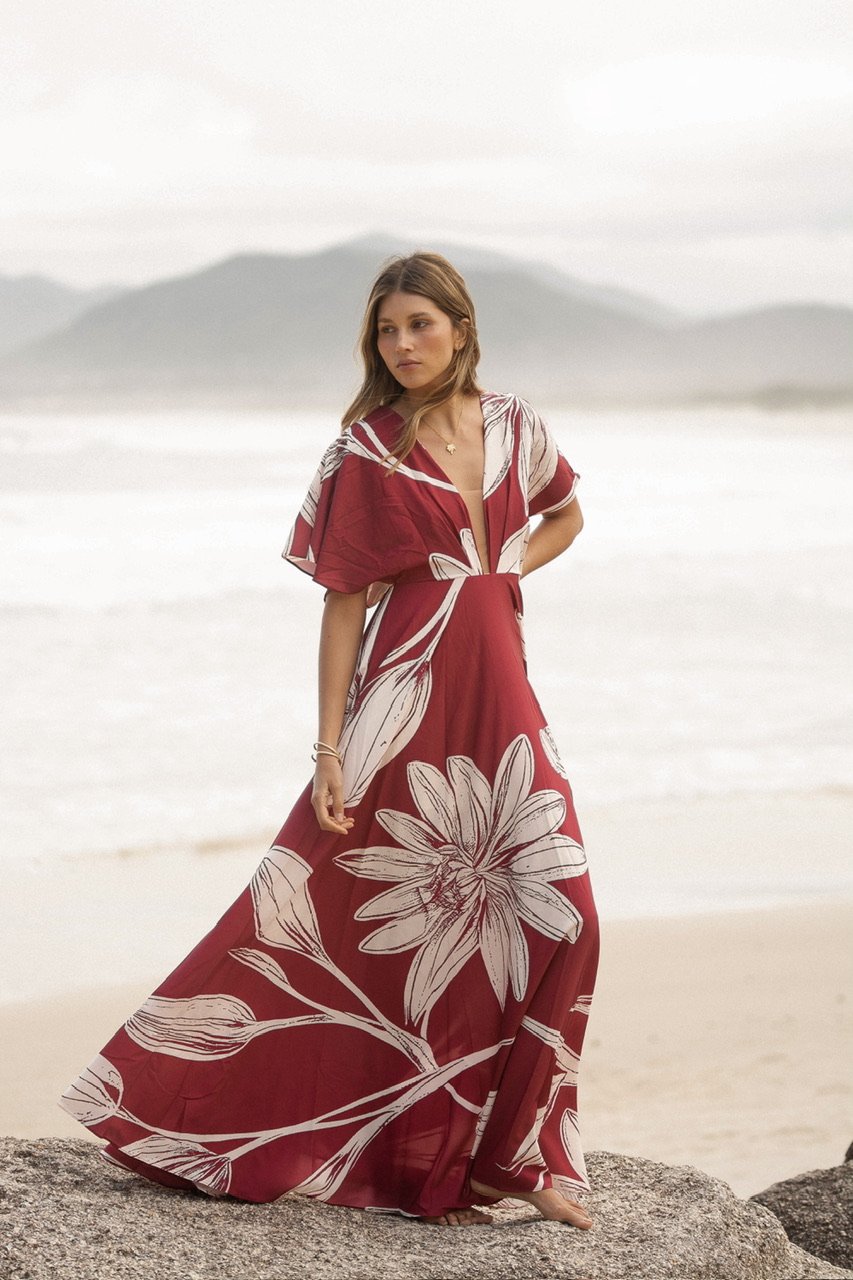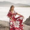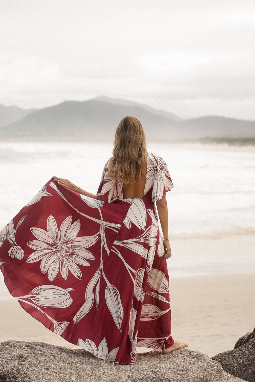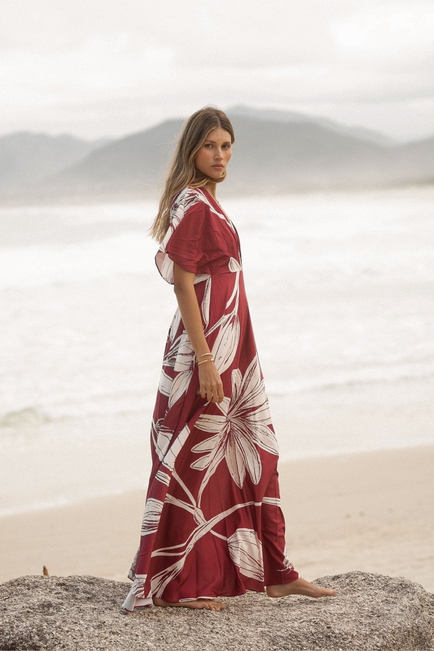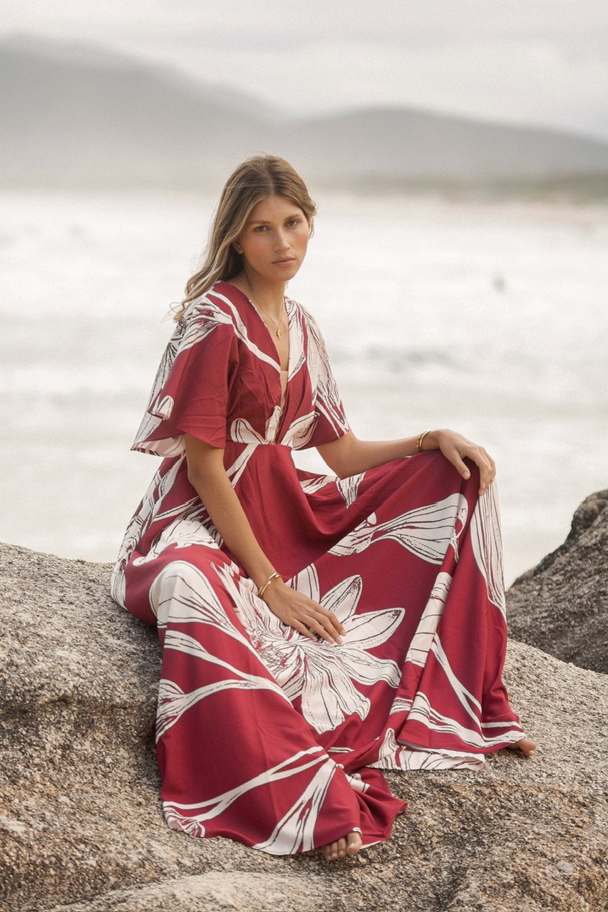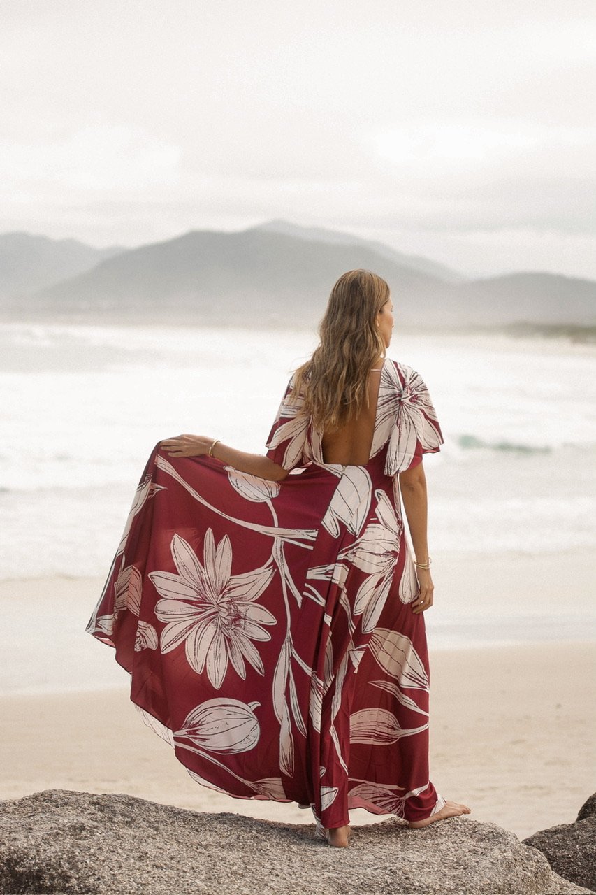 Confeccionado en una tela liviana y de tacto sedoso, cae con gracia y acompaña cada paso con elegancia natural. El estampado floral en blanco sobre fondo vino le da carácter y sofisticación, un guiño a la fuerza y dulzura de la mujer latina.