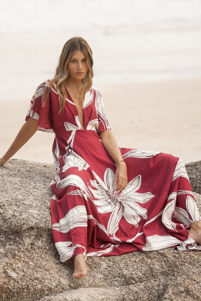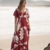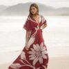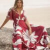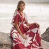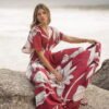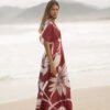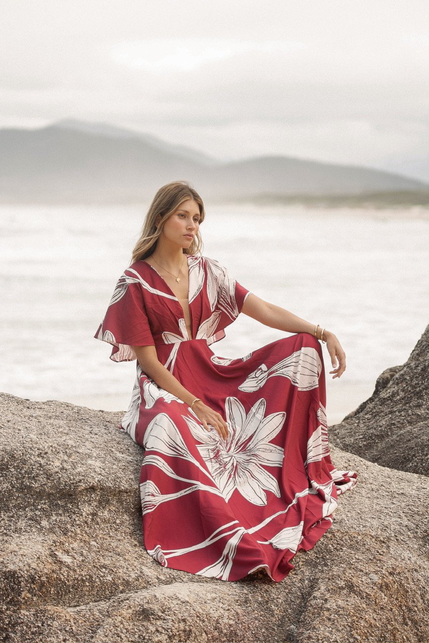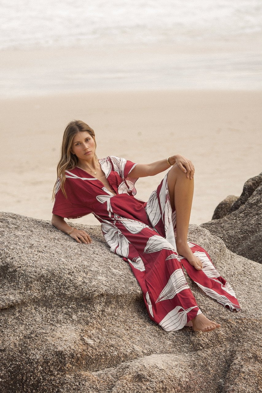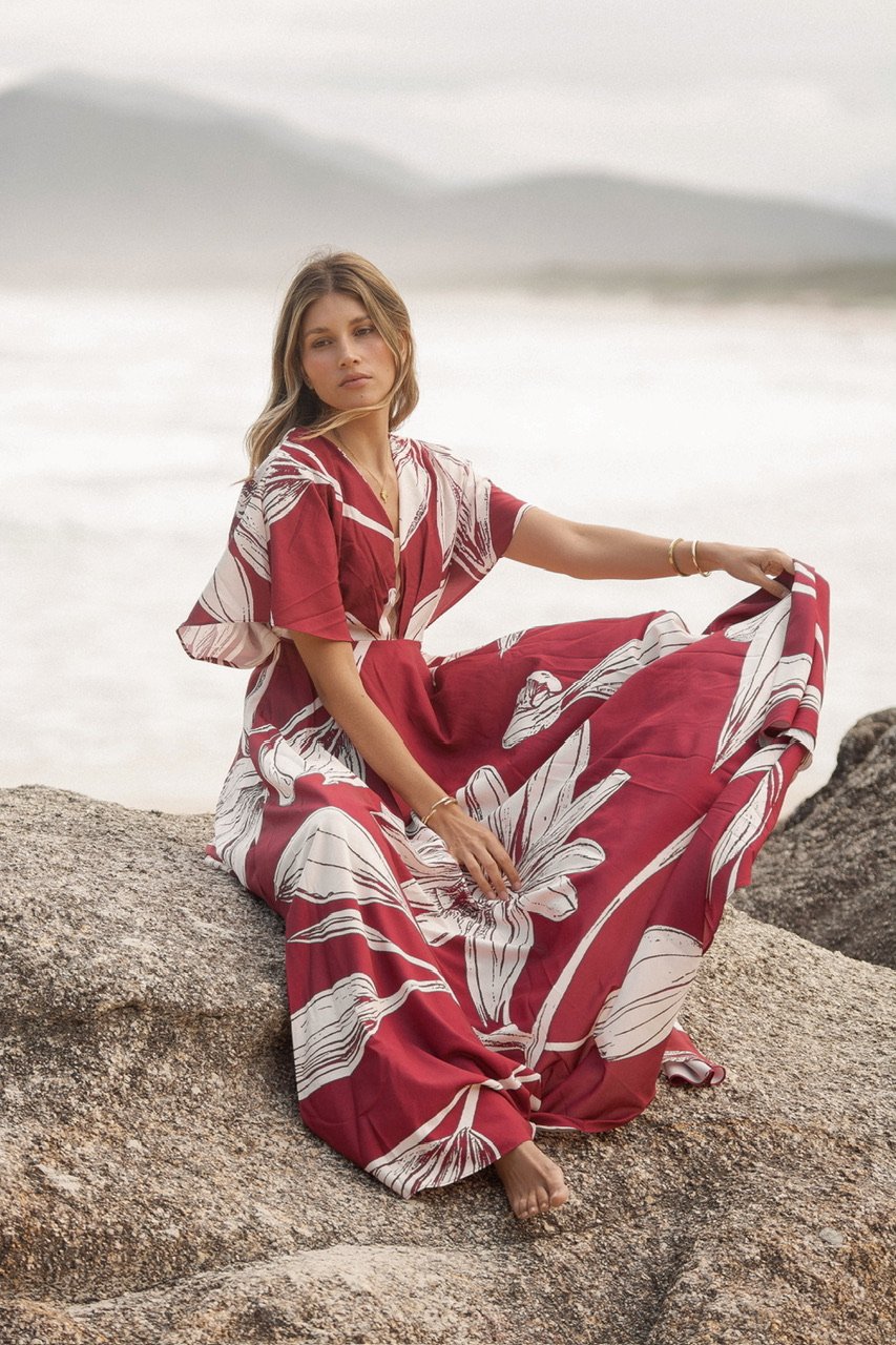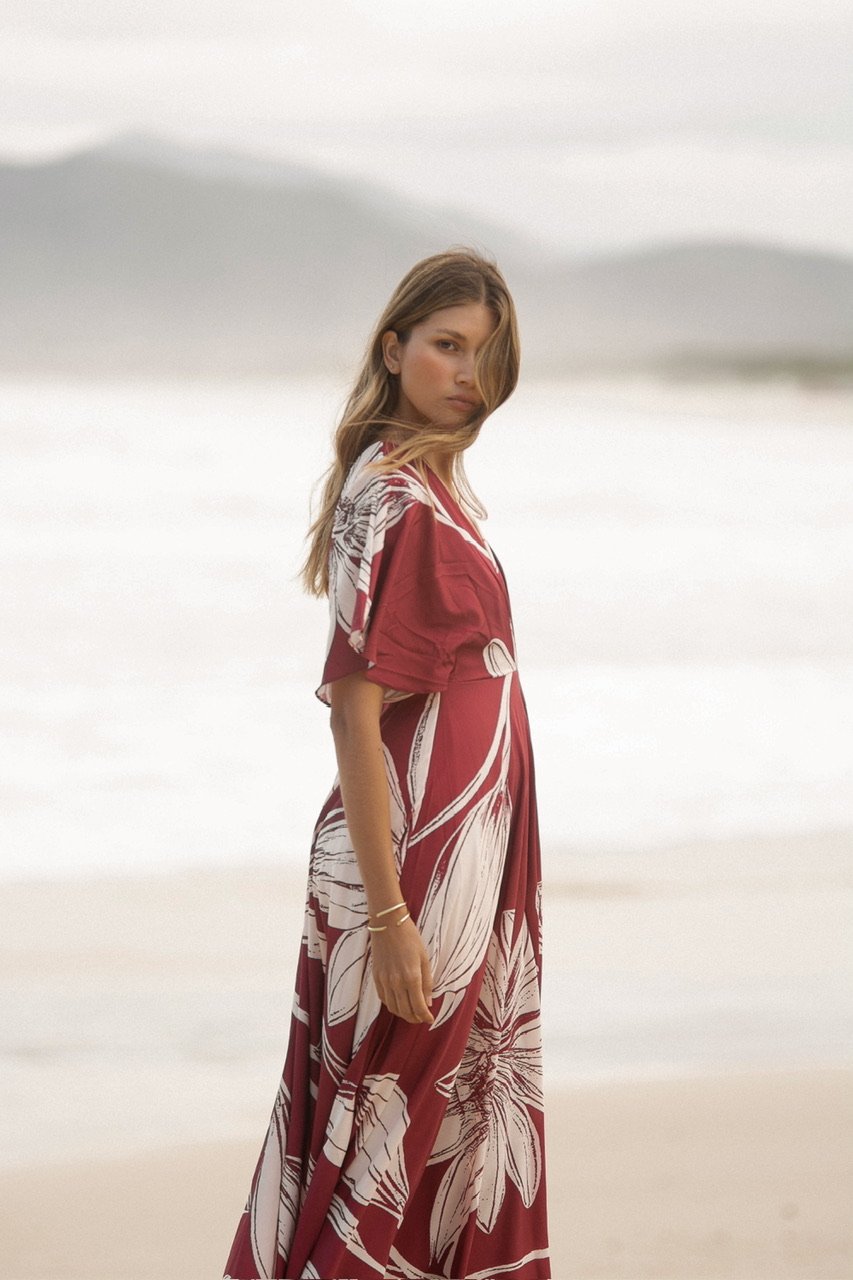 Confeccionado en una tela liviana y de tacto sedoso, cae con gracia y acompaña cada paso con elegancia natural. El estampado floral en blanco sobre fondo vino le da carácter y sofisticación, un guiño a la fuerza y dulzura de la mujer latina.