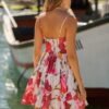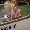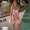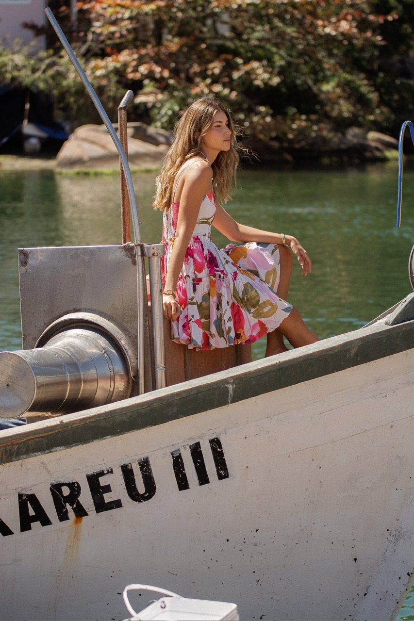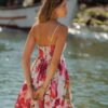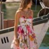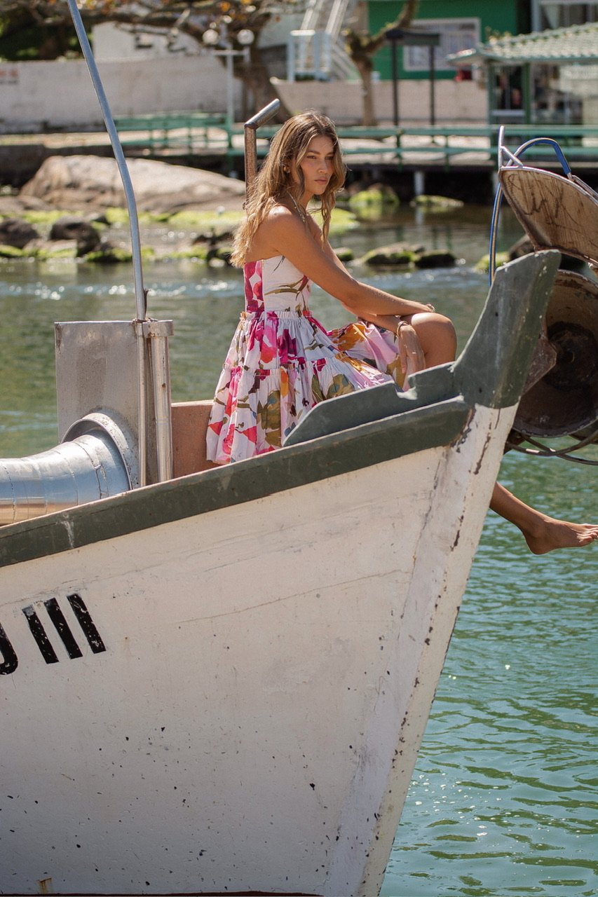El estampado floral en tonos vivos rosas, fucsias, naranjas y verdes sobre fondo marfil, evoca los colores del atardecer reflejados en el mar, un tributo a la belleza natural y al encanto tropical.