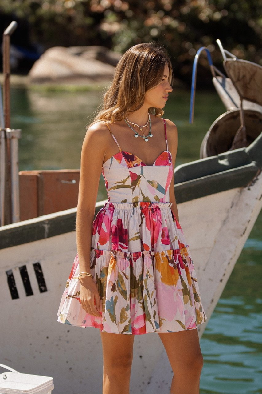 Con una silueta mini de vuelo amplio y falda en capas, Flor de Sal celebra la frescura y la coquetería con un aire sofisticado. Su bustier estructurado con escote corazón realza la figura, mientras los finos tirantes añaden delicadeza y equilibrio.