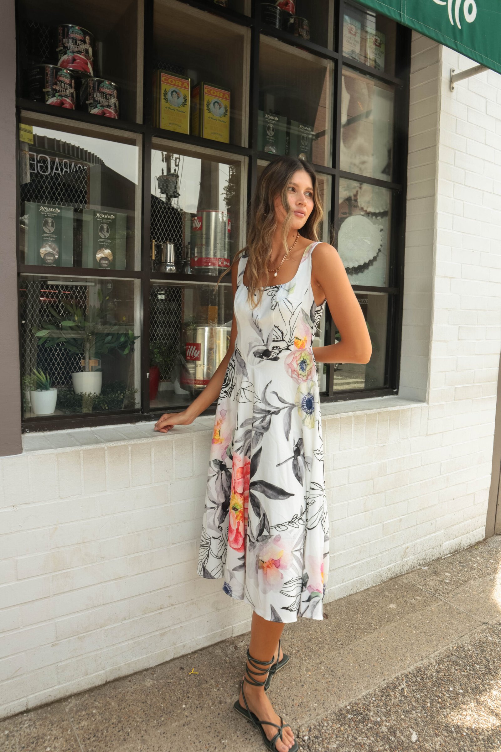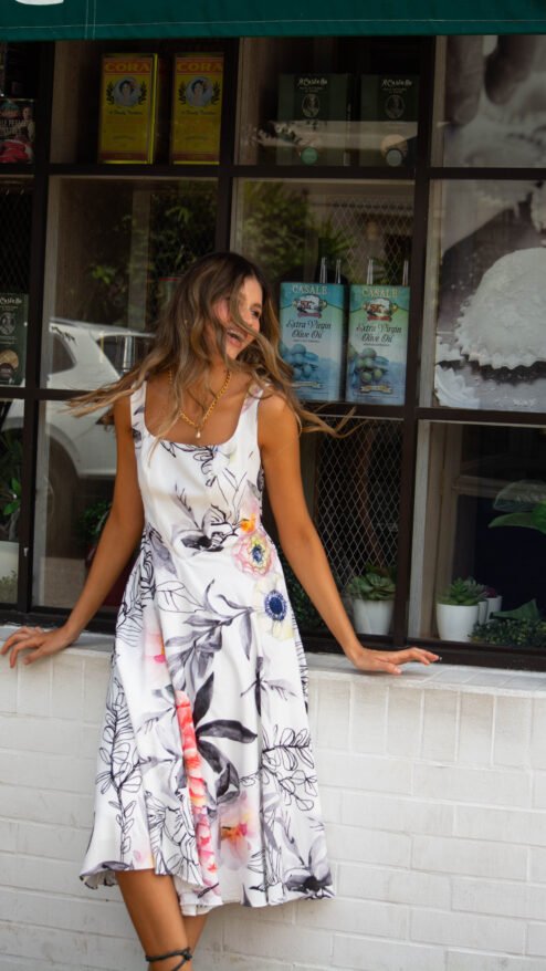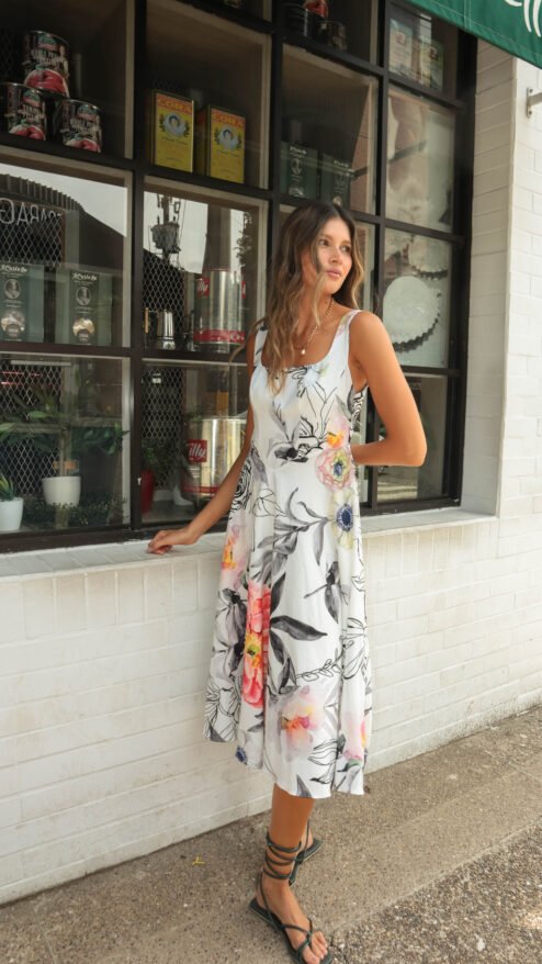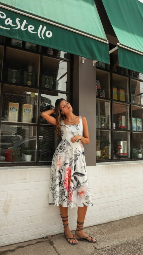 3. Para una noche especial: Lleva el vestido Florecer con tacones nude y un collar statement. Un peinado recogido dejará todo el protagonismo al estampado floral, haciendo que luzcas sofisticada.