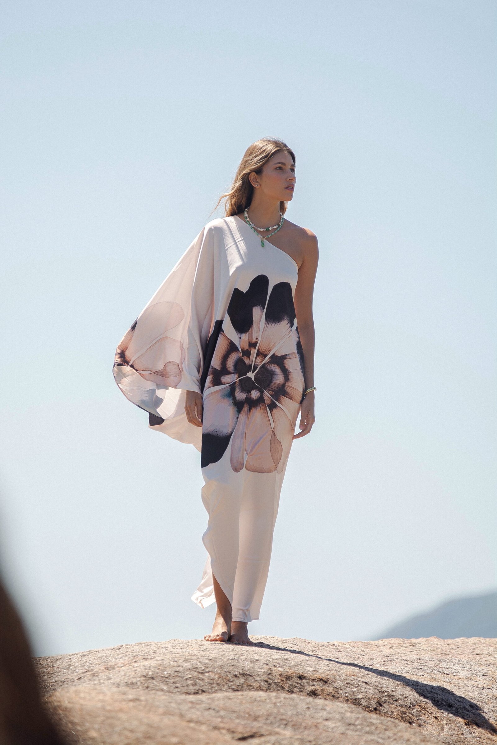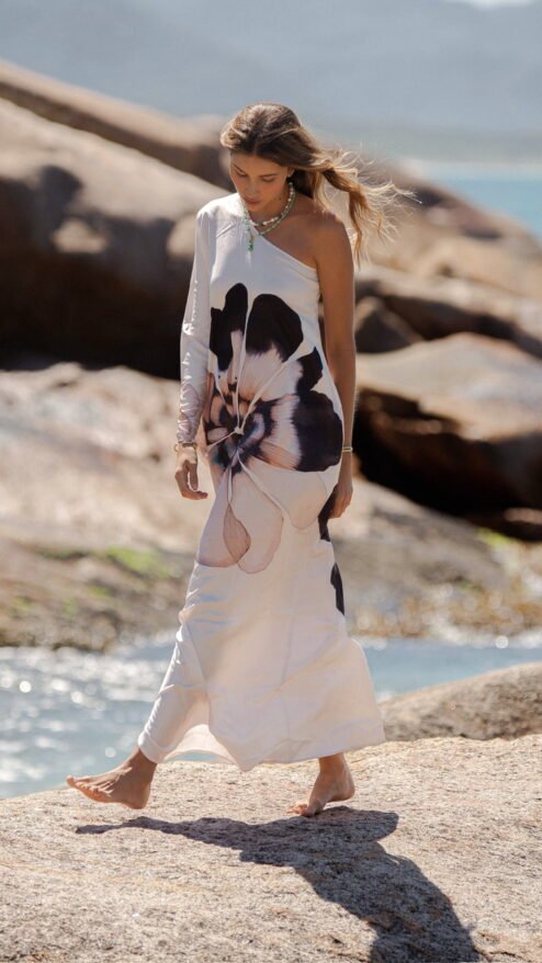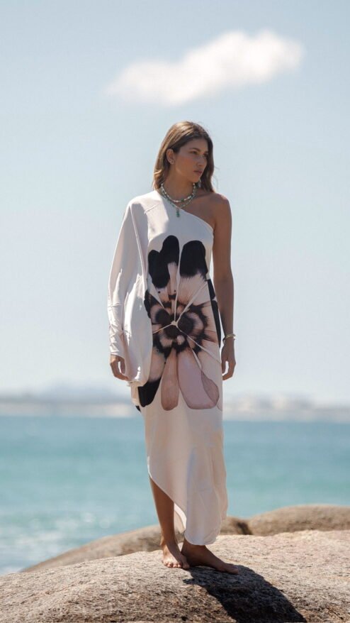 Con su silueta asimétrica de un solo hombro, Floripa redefine la elegancia relajada: un corte limpio que cae con suavidad, creando un movimiento hipnótico a cada paso. Su estampado floral oversize: una flor que parece pintada al agua, en tonos humo, crema y negro profundo, convierte el vestido en una obra de arte viva. La ubicación del estampado puede variar.