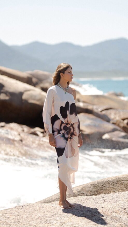 Hay prendas que se sienten como un susurro del verano, como si te envolvieran en esa luz suave que queda justo después del mediodía en la costa brasileña. Floripa nace ahí: en un instante sereno frente al mar, donde el viento mueve la tela con gracia y cada paso se convierte en una pequeña celebración de libertad. Es un vestido que invita a respirar hondo, a caminar despacio, a sentir la piel despierta bajo el sol… y a recordar lo bella que puede ser la vida cuando fluimos con ella.