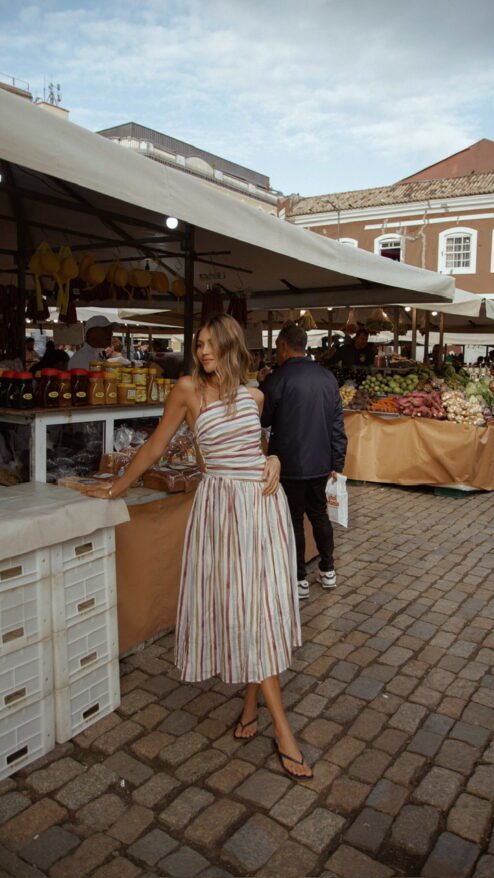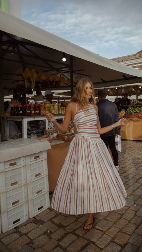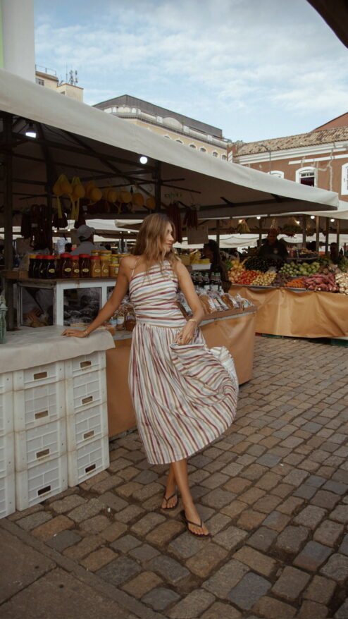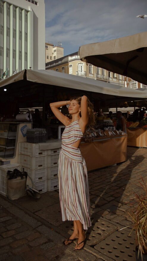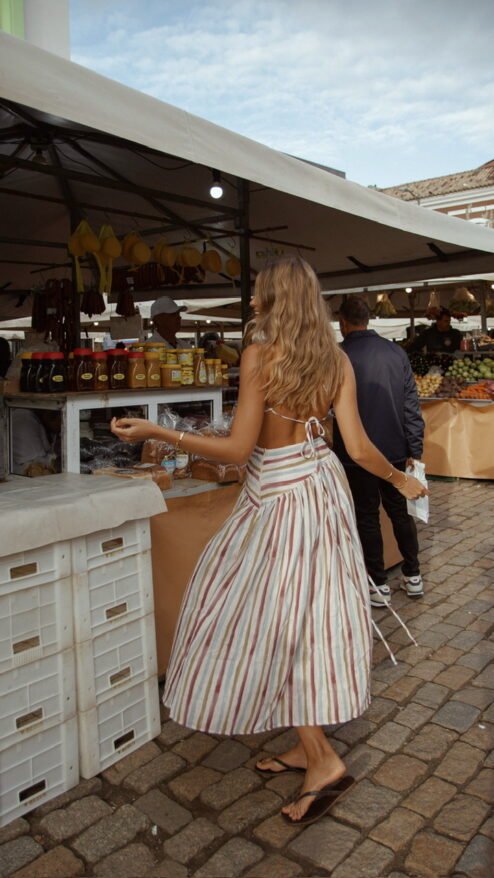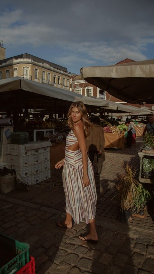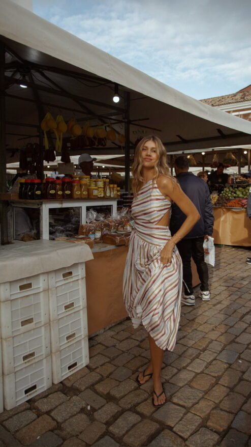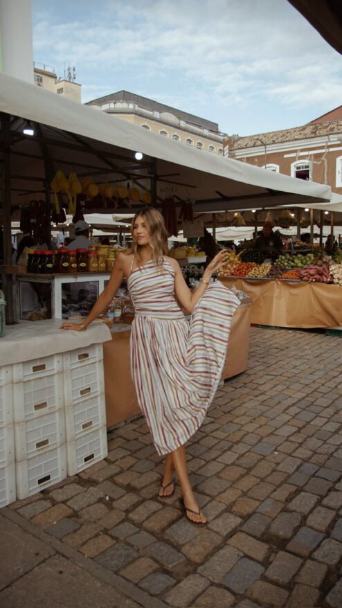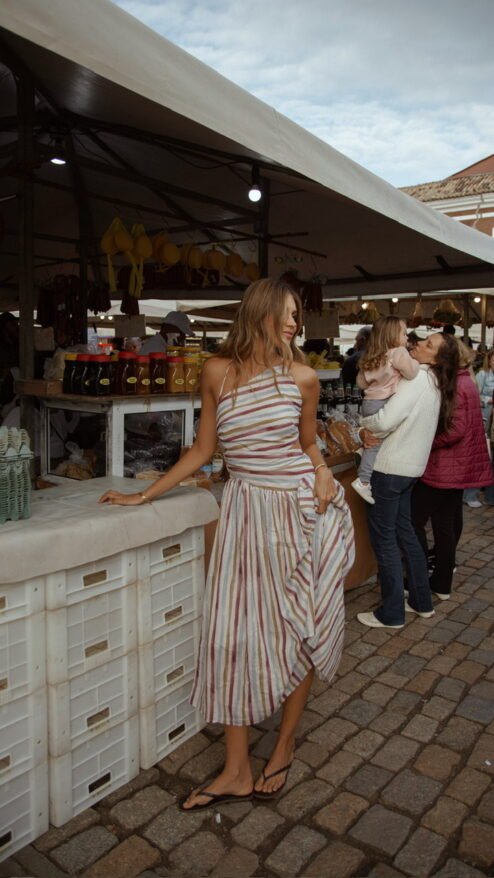 A veces la vida se detiene en un instante dorado: el sol tibio de la mañana, el olor fresco de mercado, el murmullo alegre de una ciudad que despierta. Garúa nace de esos momentos simples que saben a libertad. Un vestido que se mueve contigo con la misma naturalidad con la que caminas por calles adoquinadas, descubres sabores nuevos o simplemente dejas que el viento te acaricie el alma. Es la esencia de Florianópolis: cálida, espontánea, auténticamente latina.