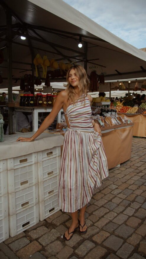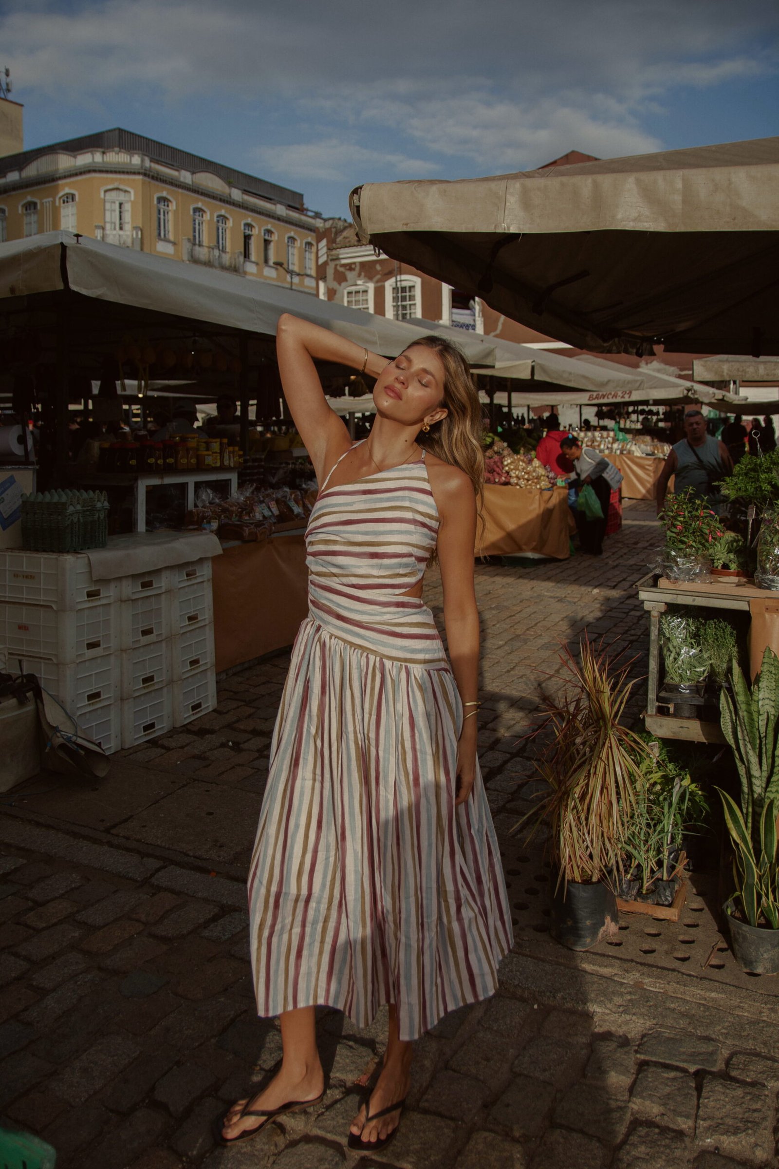 Su tejido ligero, rayado en tonos tierra, arena y vino, evoca las sombras cálidas de una tarde en el sur de Brasil. Los cortes laterales estratégicos estilizan la cintura sin perder comodidad, mientras el amarre posterior permite un ajuste personalizado que favorece la figura de manera natural.
