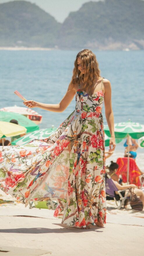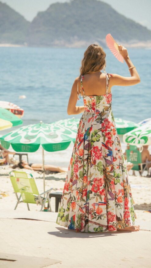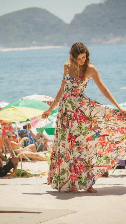 Este vestido captura la esencia vibrante de un paraíso tropical, con un diseño fluido y un estampado único que celebra la naturaleza exuberante. Su diseño tipo corset estructurado realza tu figura mientras la falda amplia aporta movimiento y frescura. Ideal para esos momentos en los que quieres sentirte libre, elegante y auténtica. Ya sea caminando por la playa o disfrutando de una fiesta al atardecer, este vestido será tu compañero perfecto.