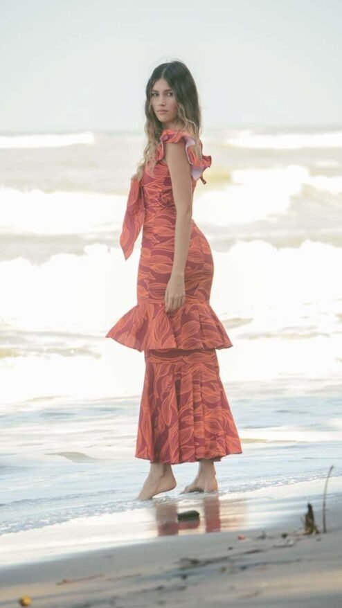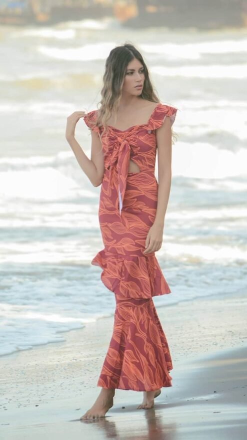 Vestido largo con golas en la parte inferior y nudo en el pecho; en estampado de silueta de hojas en color naranja, de fondo vino tinto. Tiene cierre en la parte posterior.