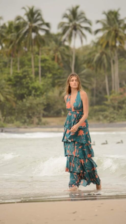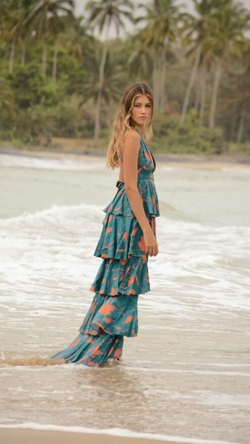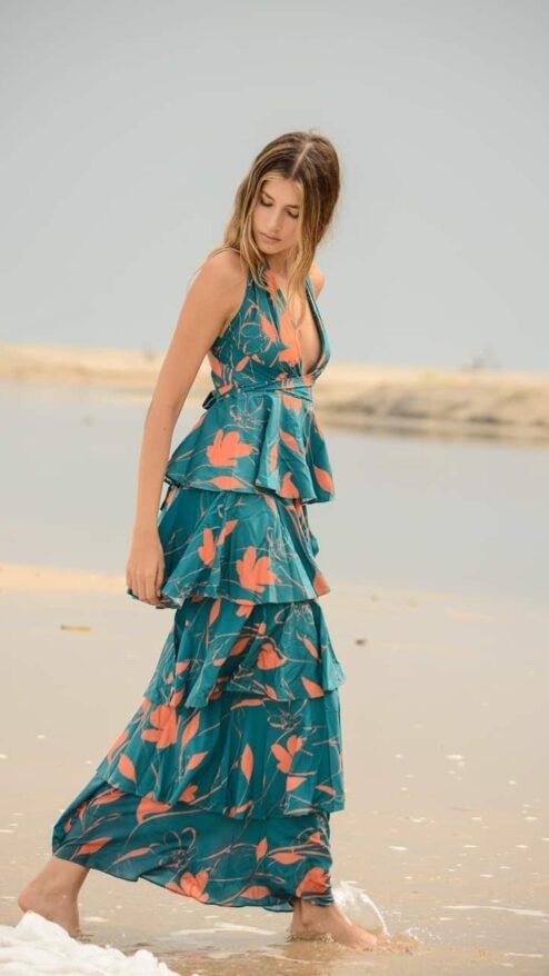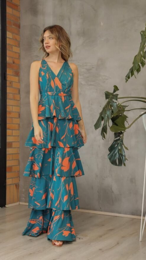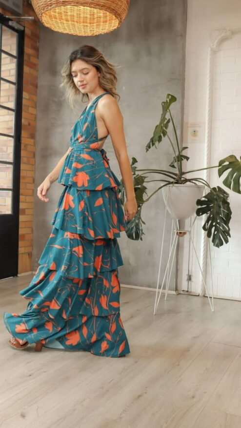 Vestido largo con escote en V y tiras largas que pueden usarse de varias formas; falda larga en capas, cremallera en la parte posterior. Estampado de siluetas de flores y hojas en color naranja de fondo verde jade. Tela suave, fresca y ligera.