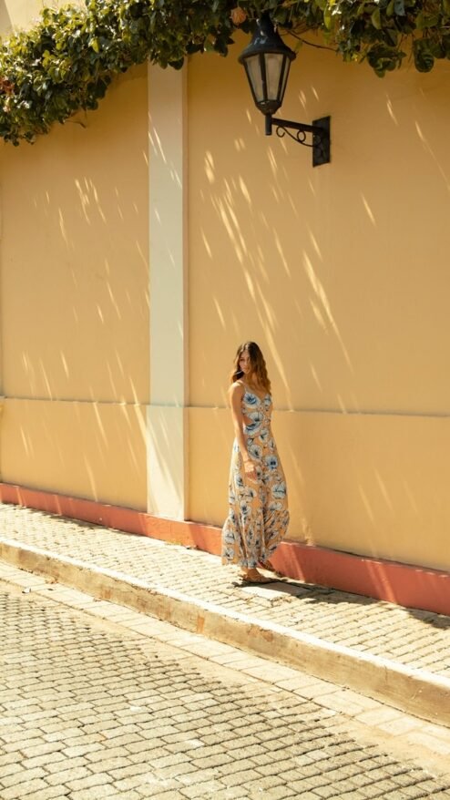 Vestido largo de tiras, con escote cruzado, plisado en la parte inferior de la falda, se ajusta en la espalda con dos tiras gruesas. Estampado de flores grandes blancas, de fondo amarillo.