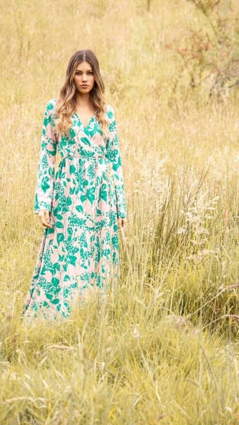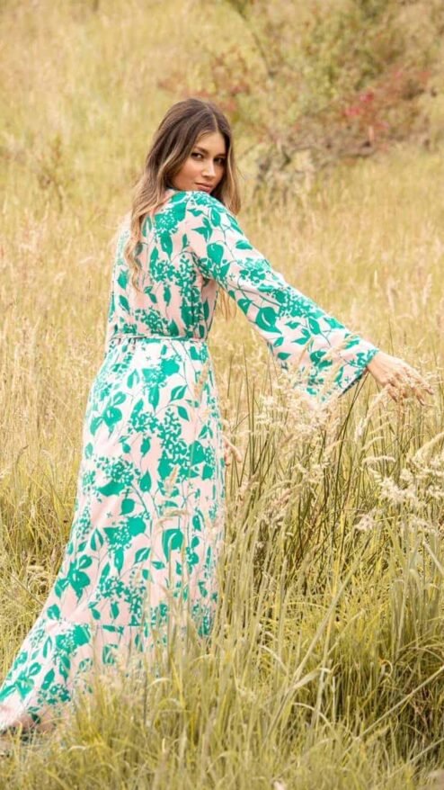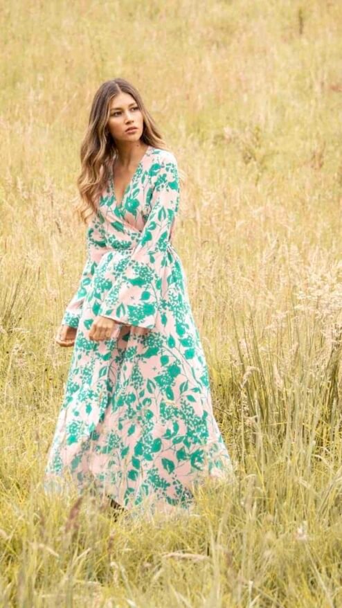 Vestido largo con silueta wrap en estampado de hojas verdes y fondo rosado