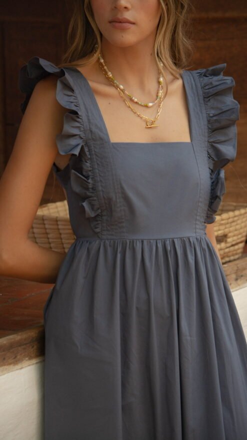 Vestido largo de falda amplia, con escote cuadrado y volantes en los hombros que van hasta el pecho. Corte a la cintura y escote en la espalda.