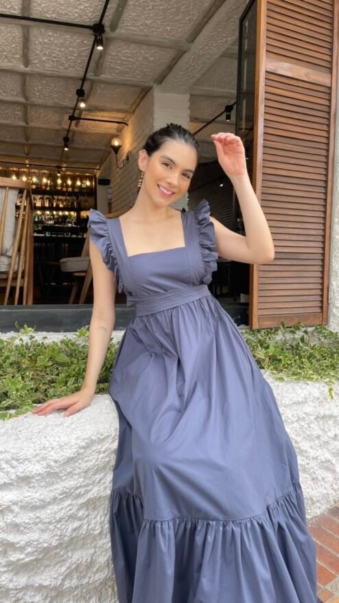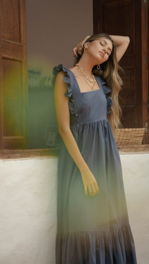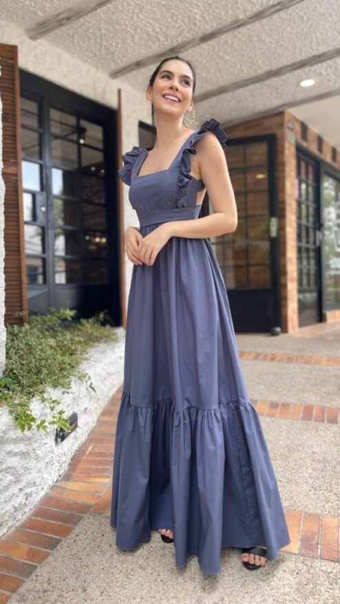 vestido largo de volantes en los hombros