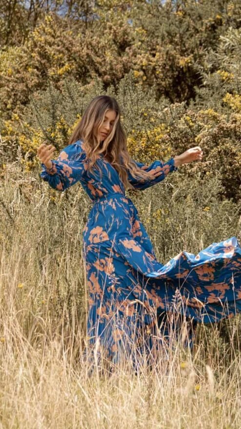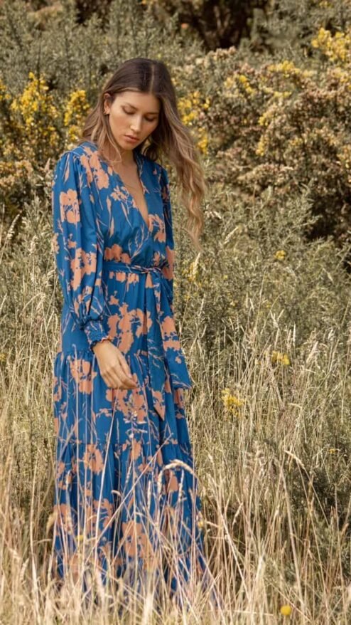Vestido largo con manga bombacha en color azul clásico y estampado de siluetas florales, con escote profundo en V. Con fajón ajustable.