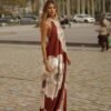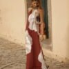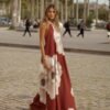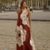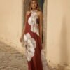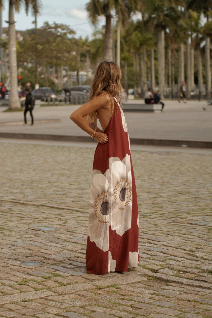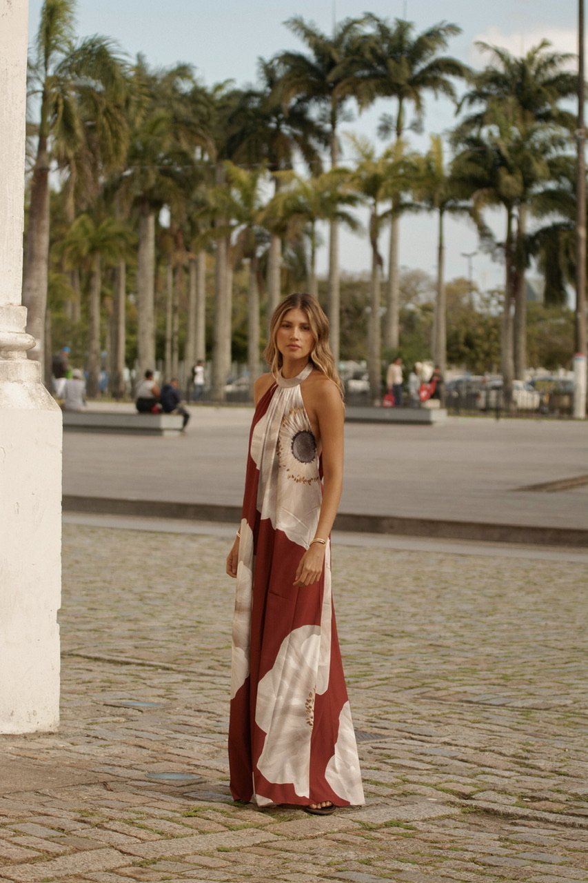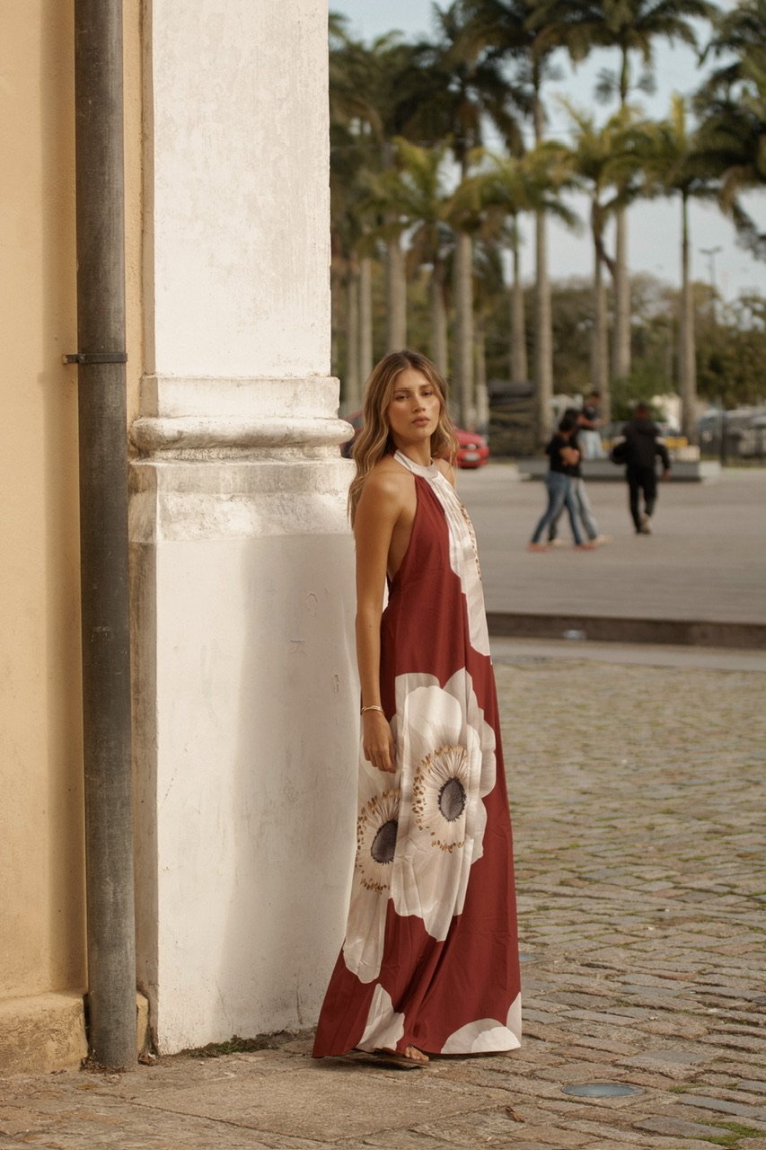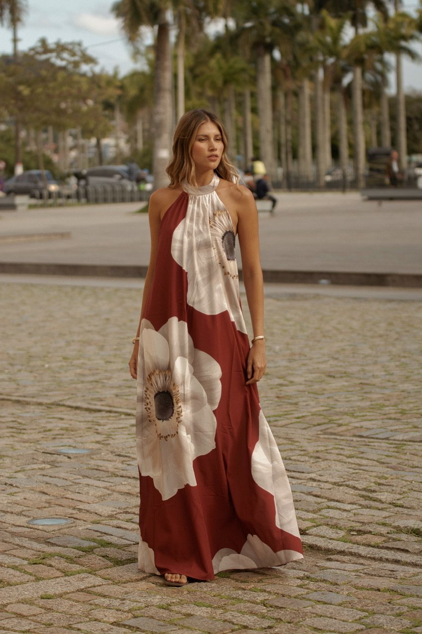 Maranta es un maxi vestido halter de silueta amplia y caída fluida, diseñado para moverse contigo y crear un efecto etéreo al caminar.