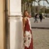 Está confeccionado en un estampado floral oversized en tonos vino y marfil, que combina la fuerza cálida de Brasil con la suavidad de las flores gigantes que parecen pintadas a mano.